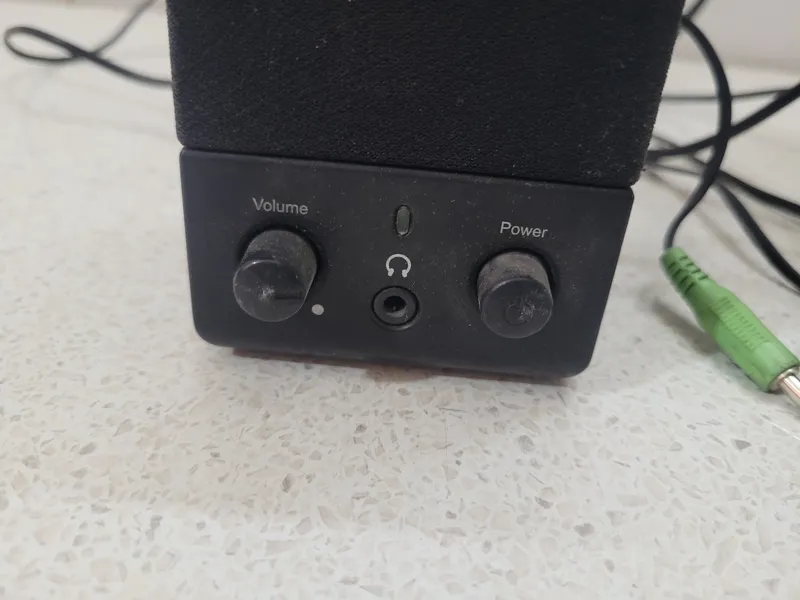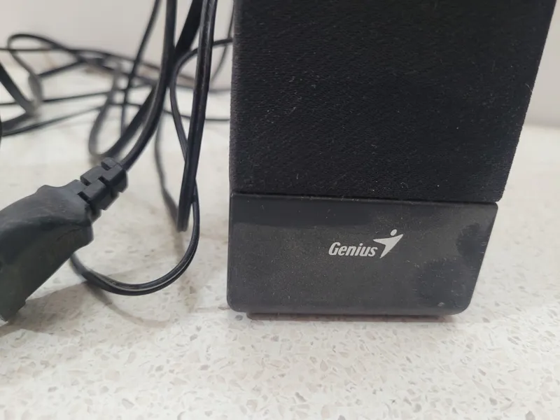 اسپیکر رومیزی 2 تکه برند Genius دارای سیم اتصال برق و سیم AUX جک 3.5 جهت پخش موزیک تمیز، سالم و بدون ایراد