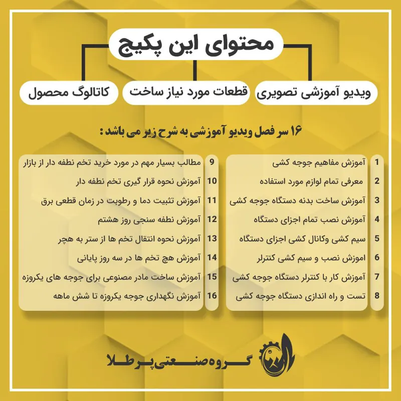 پکیج جامع آموزش صفر تا صد ساخت دستگاه جوجه کشی 42 تایی توسط گروه صنعتی پرطلا تولید و ارائه می شود. این محصول دارای دو آیتم قطعات و ویدیو آموزشی می باشد. 16 سر فصل مهم در ویدیو های اموزشی بصورت صفر تا صد توضیح داده شده است.