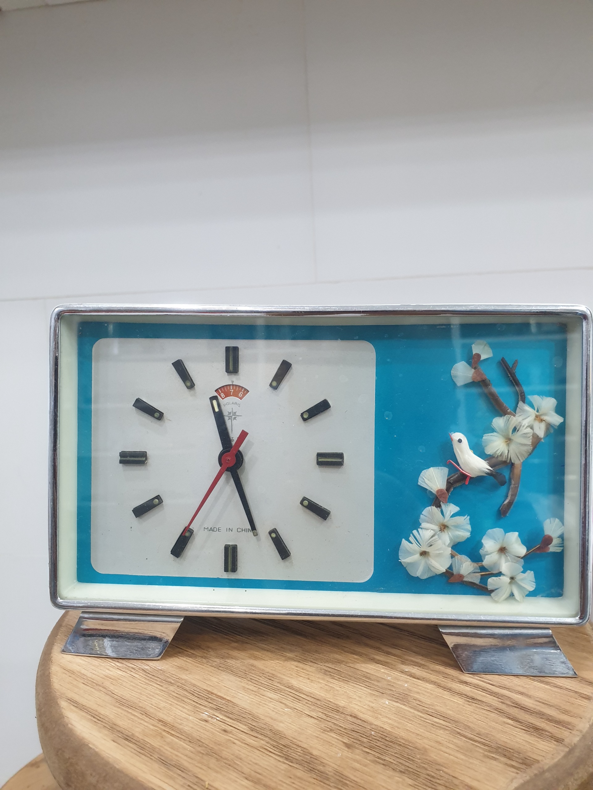 یک عدد ساعت رومیزی قدیمی که شاخه شکوفه بهاری و یک چغوک داخلش هست