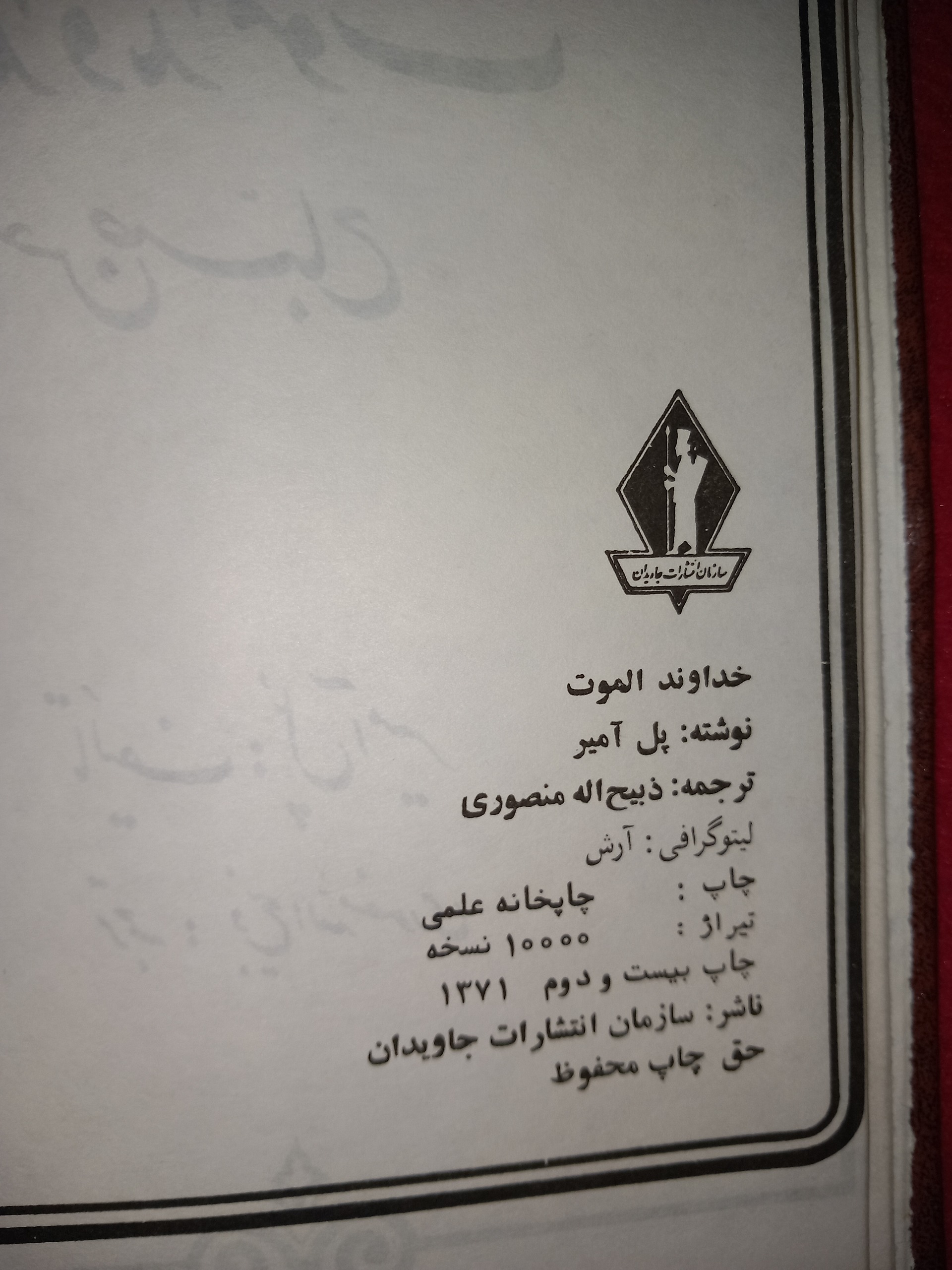 دوستان گرامی کتاب خداوند از سال 2536شاهنشاهی 1356 خورشیدی انحصاری توسط سازمان انتشارات جاویدان چاپ شده و بارها و بارها تجدید چاپ شده ولی نسخه چاپ 1362 و این نسخه 1371 به جرأت با کیفیت ترین سطح کاغذ و چاپ و جلد رو داشته