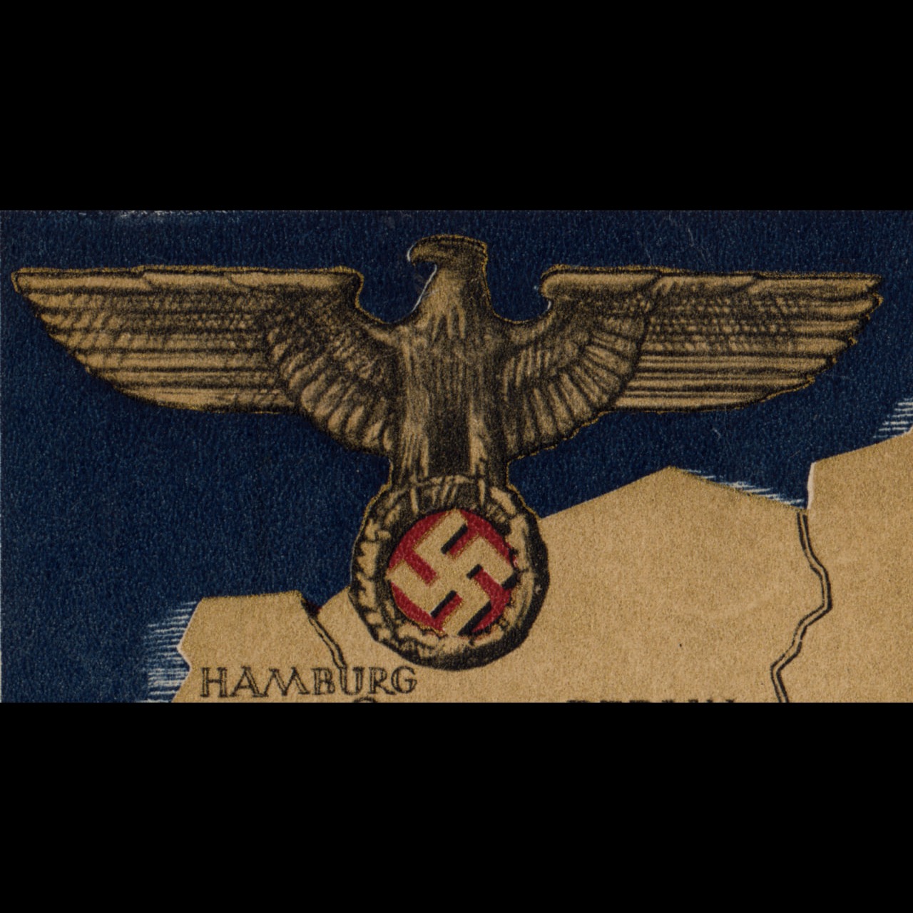 نشان نازی در بالای نقشه، یک عقاب (نشان سنتی آلمان) که چنگالهایش صلیب شکسته (swastika) را گرفته است، دیده میشود.