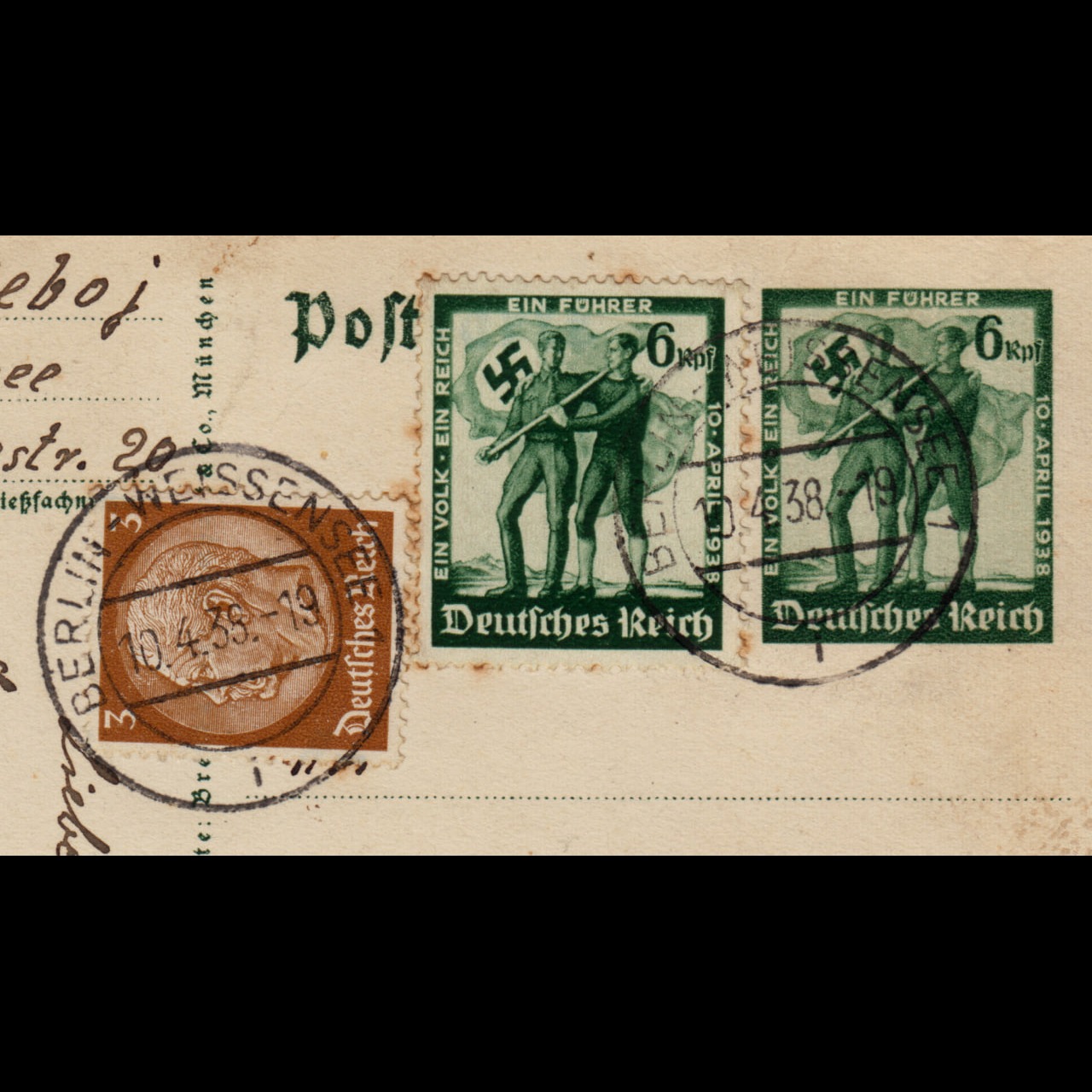 تمبرها تصویری از سربازان نازی با شعار "یک ملت، یک امپراتوری، یک پیشوا" را نشان میدهند.
