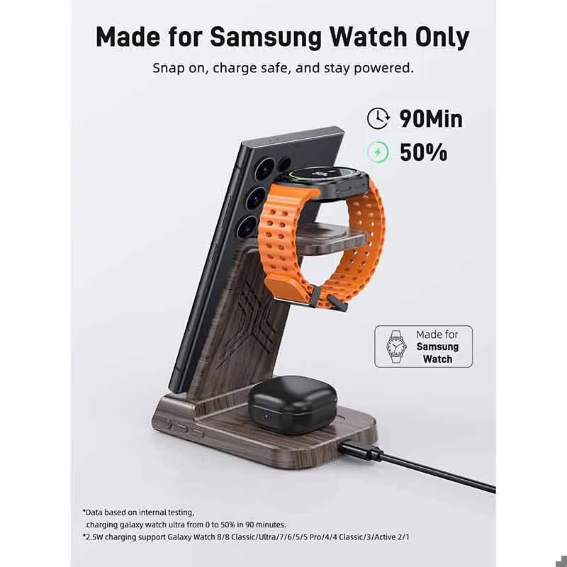 شارژر بیسیم 3 در 1 برای سامسونگ: گوشی، ساعت هوشمند گلکسی واچ و هدفونهایتان را همزمان شارژ کنید، از کابلها جلوگیری کنید و میزتان را مرتب نگه دارید. طراحی جمع و جور و بیصدای آن کاملاً روی میز کنار تخت، میز یا اتاق نشیمن شما قرار میگیرد و به راحتی نیازهای