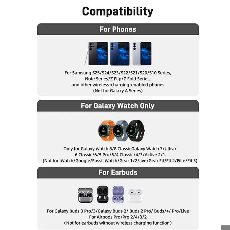 سازگاری سود: مناسب برای سامسونگ گلکسی زد فلیپ 7/فولد 7، S25 اولترا/S24 اولترا/S23 اولترا/S22/S22+/S22 اولترا/S21/S21+/S21 اولترا/S20+/S20 اولترا/نوت 20؛ آیفون 16 پرو مکس/15/14/13/12/8 پلاس؛ گلکسی بادز 2 پرو/بادز؛ گلکسی واچ 8/اولترا/7/6/5/5 پرو/4/4 کلاسیک/3/اکتیو