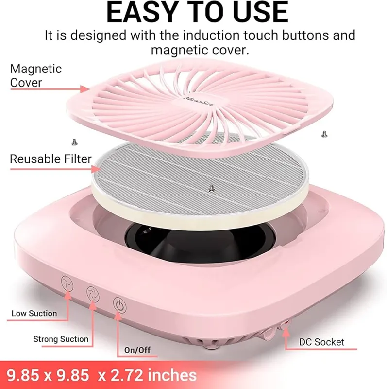 فیلتر گرد و غبار ناخن قابل استفاده مجدد: با یک پوشش مغناطیسی و فیلتر قابل استفاده مجدد، می توانید به راحتی فیلتر را خارج کرده و به راحتی آن را با سشوار یا برس گرد و غبار تمیز کنید، بدون نیاز به هر بار تعویض آن.