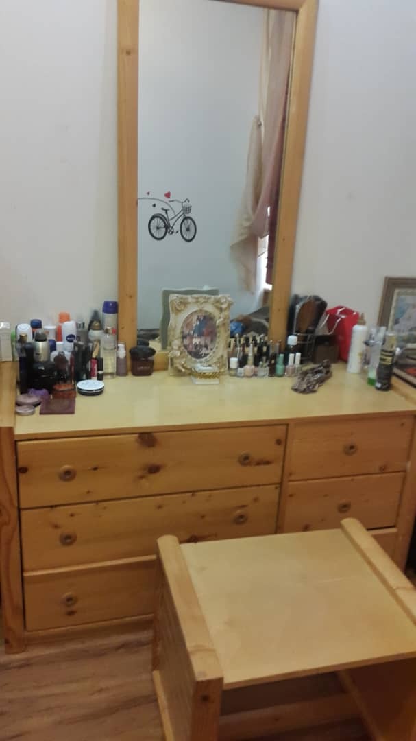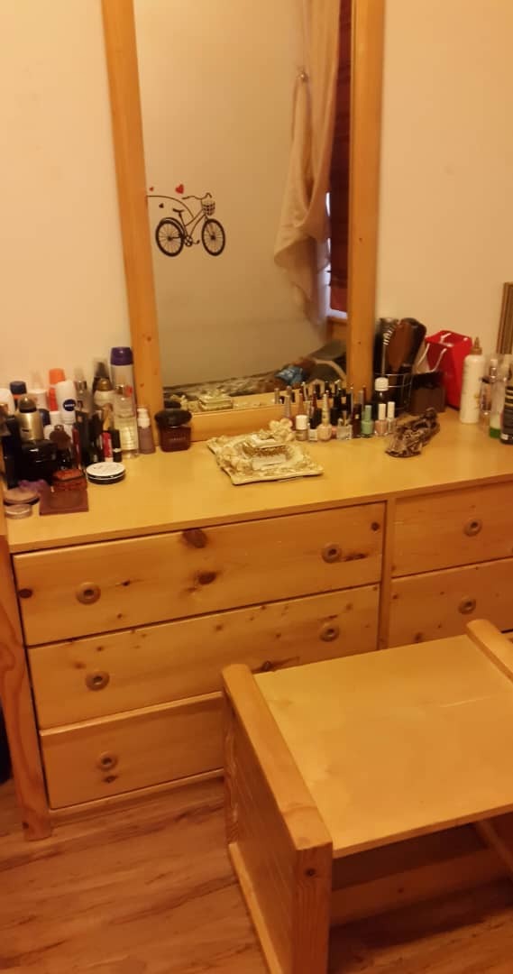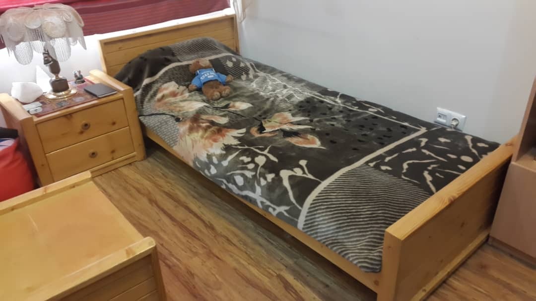 سرویس اتاق خواب تک نفره شامل تخت ، میز آرایش ، پاتختی ، میز تحریر ، یک آینه بزرگ و یک صندلی ، تمام چوب راش ، سالم
