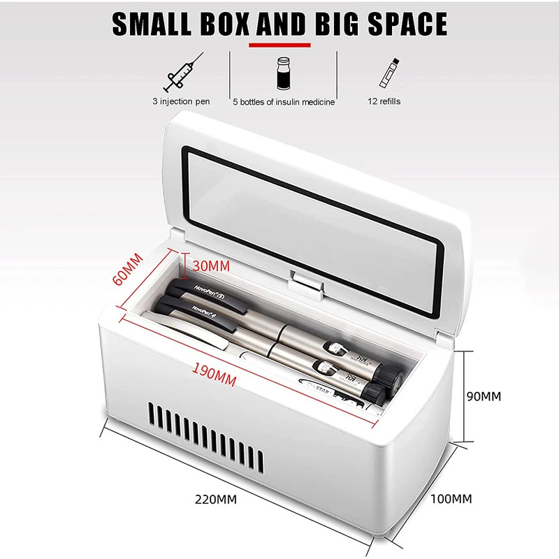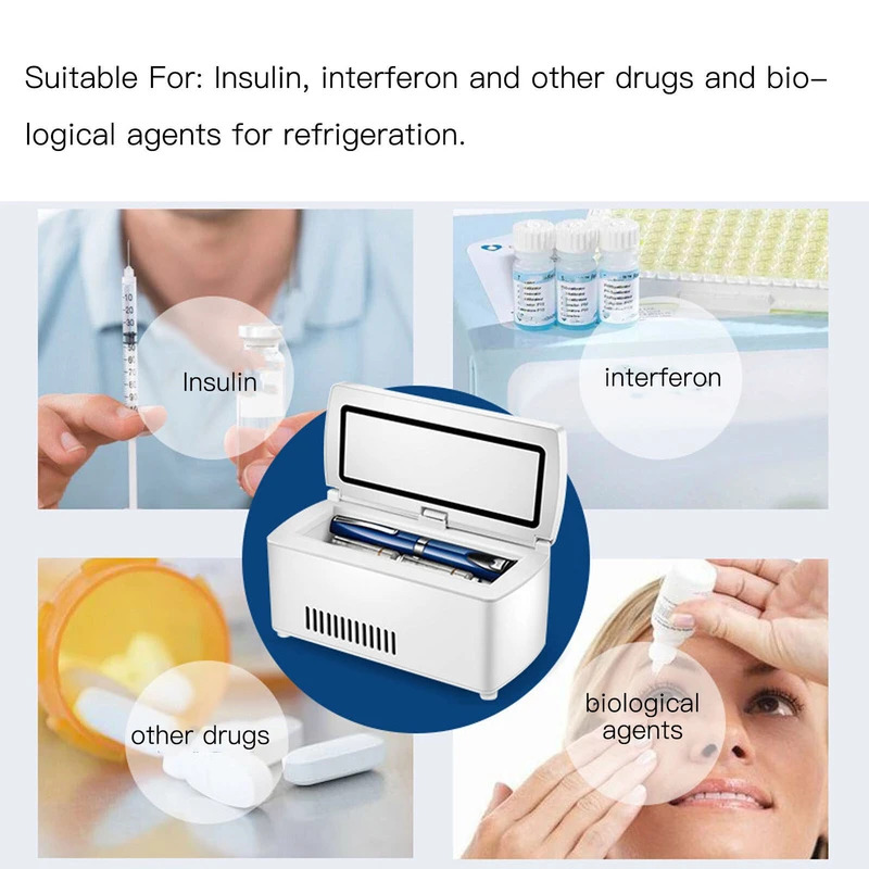 خاصی برای نگهداری انسولین و یا سایر داروهایی نظیر هورمون رشد یا قطره چشم که به سرما نیاز دارند، مجهز می باشد که می توان نسبت به انتقال آنها از جایی به جای دیگر با یخچال انسولین اقدام نمود. بدون نیاز به برق شهری میتوان حین مسافرت آن را با فندکی ماشین شارژ کرد