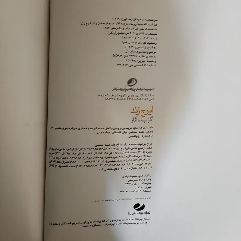 این کتاب شامل نقاشی ها و مجسمه های ایرج زند است. قطع رحلی، چاپ نشر نظر 1387 با یادداشت هایی از محمدابراهیم جعفری، رویین پاکباز، مهدی سحابی، لیلی گلستان و بهرام دبیری و ...
