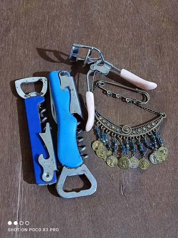 دو عدد درب بازکن چندکاره قدیمی /// یک عدد انبر مخصوص مژه مصنوعی/// و یک عدد آویز قدیمی بسیار خاص و زیبا احتمالا آویز بوده شایدم چیز دیگس قیمت برای هر چهار مورد میباشد