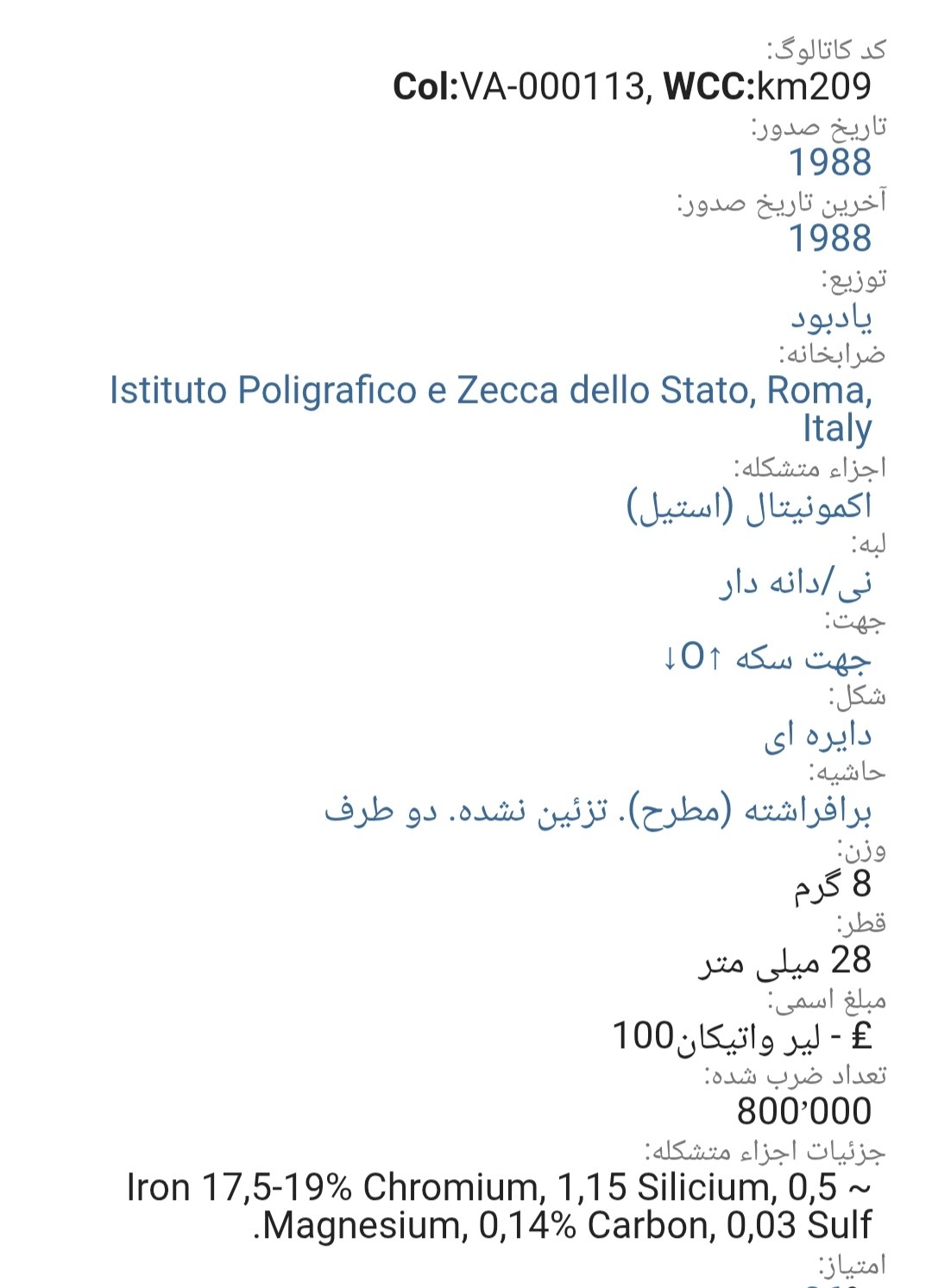 سکه 100لیره یادبودی شهر واتیکان1988 ((3002))