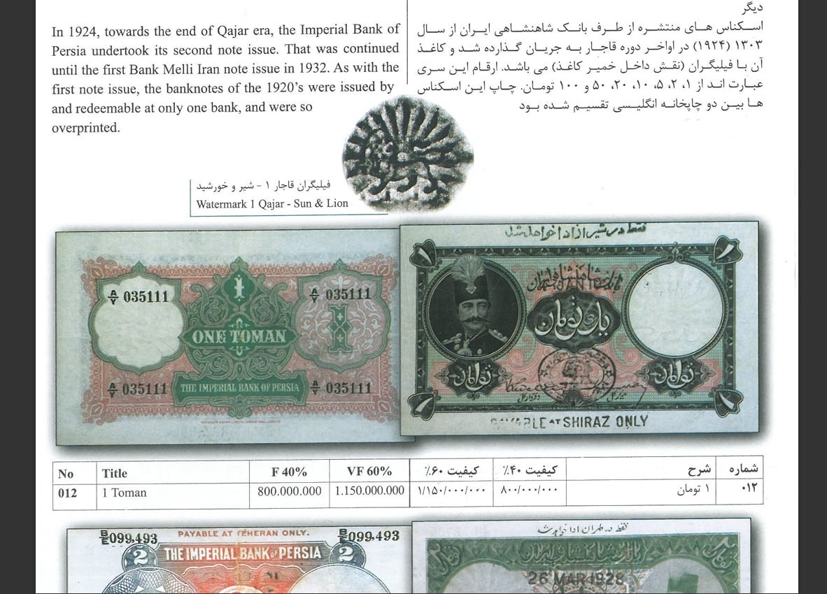 تصاویر تمام اسکناس های ایران از اولین اسکناس قاجار تا آخرین اسکناس جمهوری اسلامی تا سال 1403 همراه با قیمت در این کتاب آورده شده است.