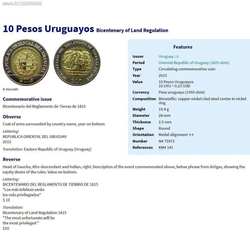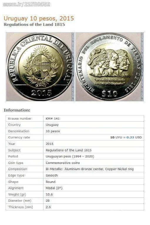 سکه یادبودی 10 پزو اروگوئه 2015 (نایاب)