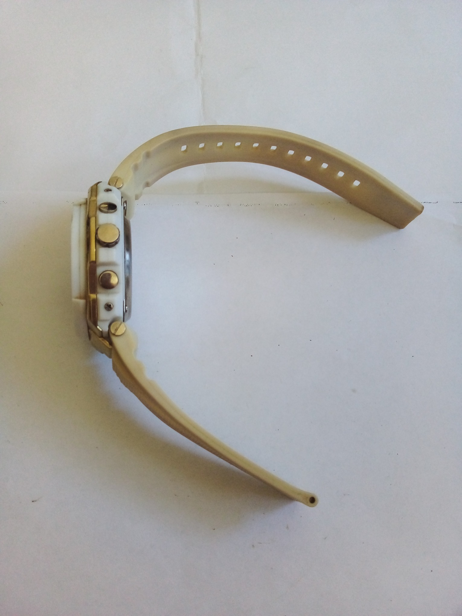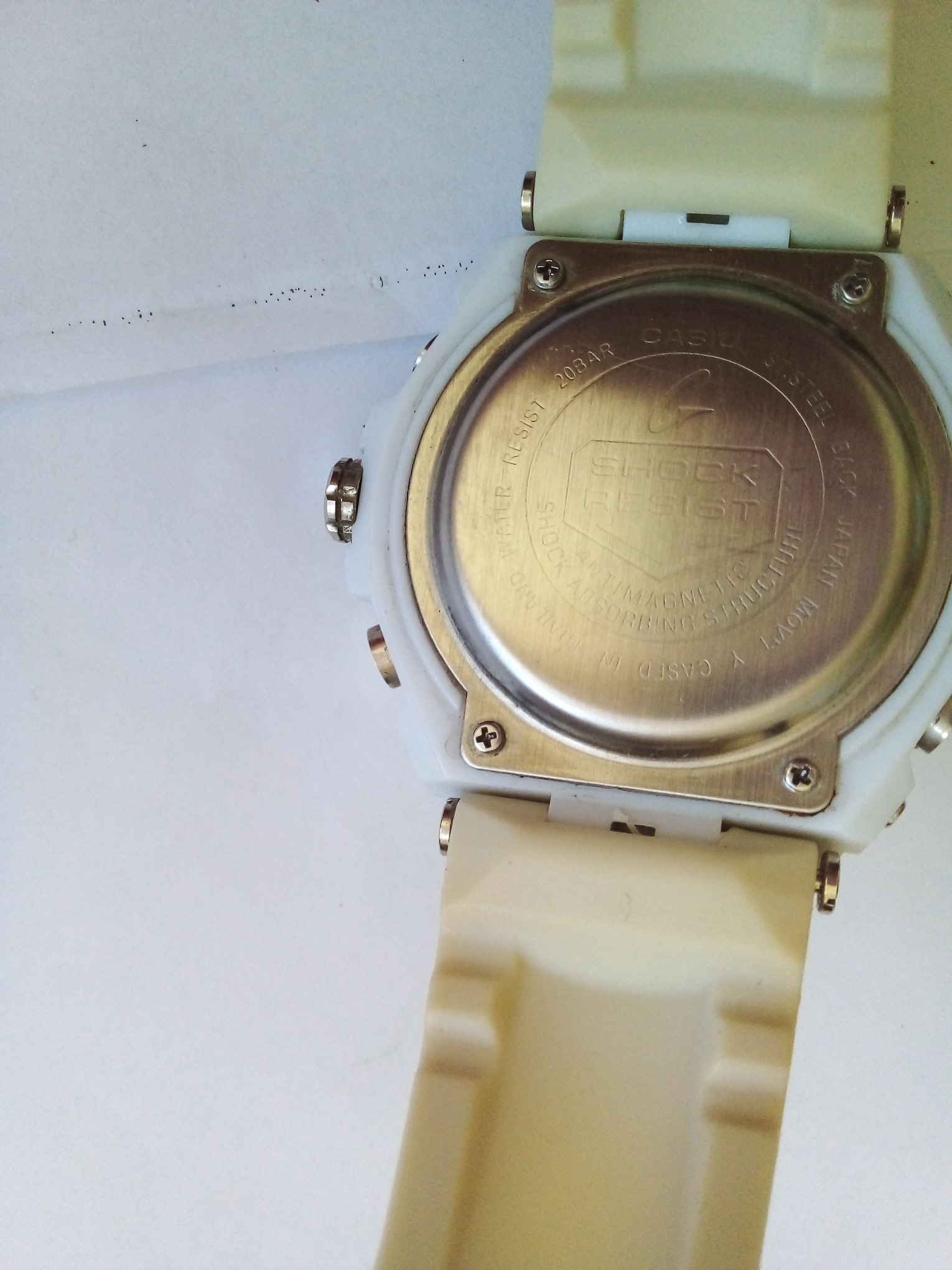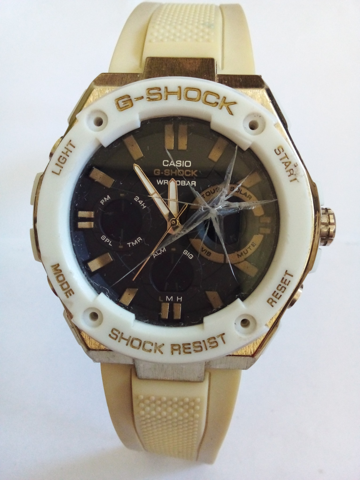 درود وروز بخیر خدمت عزیزان کاربر و سایت محترم ایسام . ساعت مچی مردانه کاسیو جی شاک ژاپنی قاب بدنه گرد وصفحه نمایش گرد وبند کرم رنگ بدون سگک وشیشه شکسته وچهار پمپ در دو طرف بدنه وموتور وپشت صفحه طبق تصاویر . عزیزان خریدار قبل از اقدام به خرید لطفا وحتمن