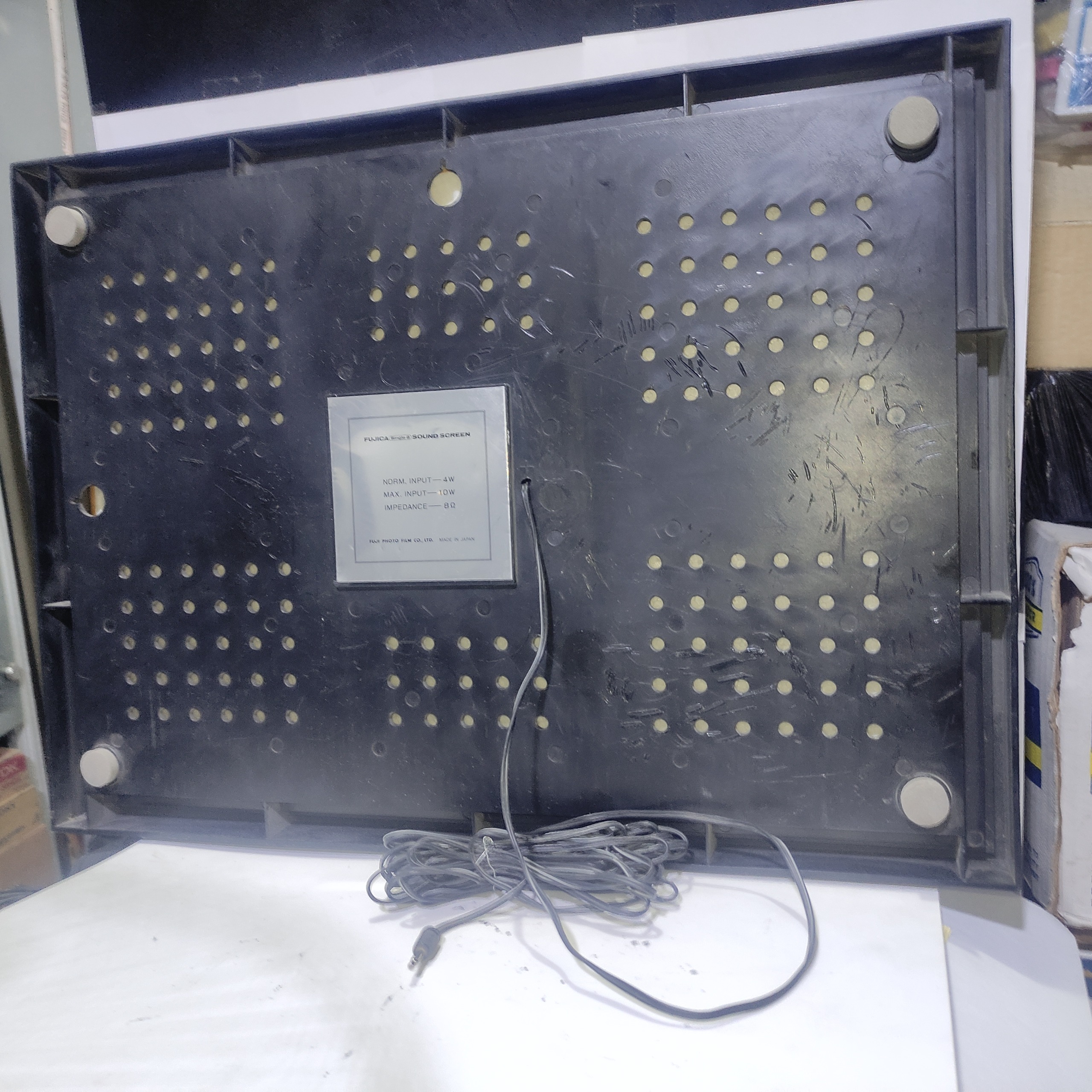 پرده و اسپیکر آپارات فوجی MULTIPLE INPUT-4W" که باتوجه به مشخصات و فیش اسپیکر آن باید به قسمت هندز فری یا فیش گوشی آپارات و یا یک منبع صوتی مطمئن دیگر هنگام پخش فیلم صامت وصل شود