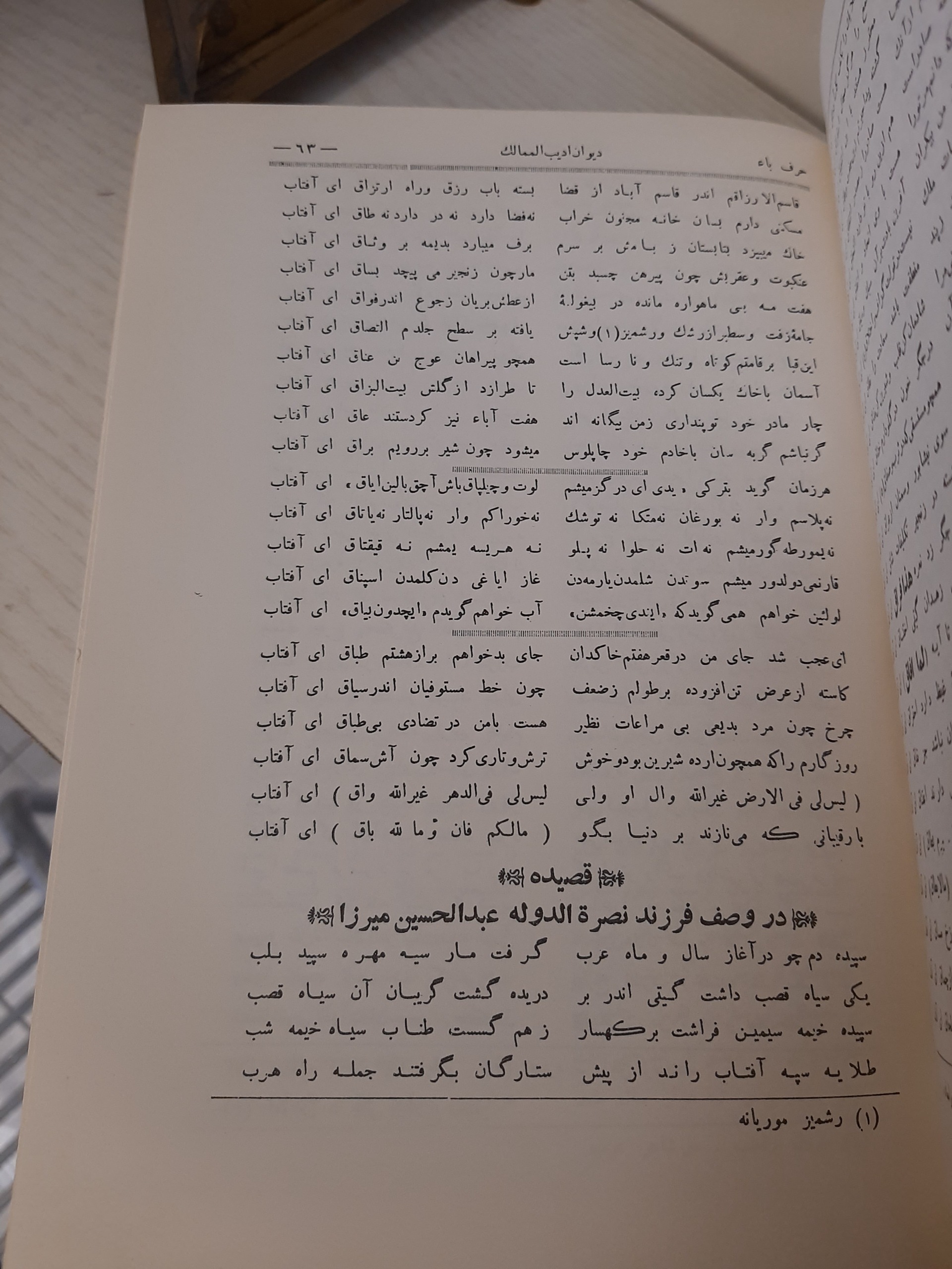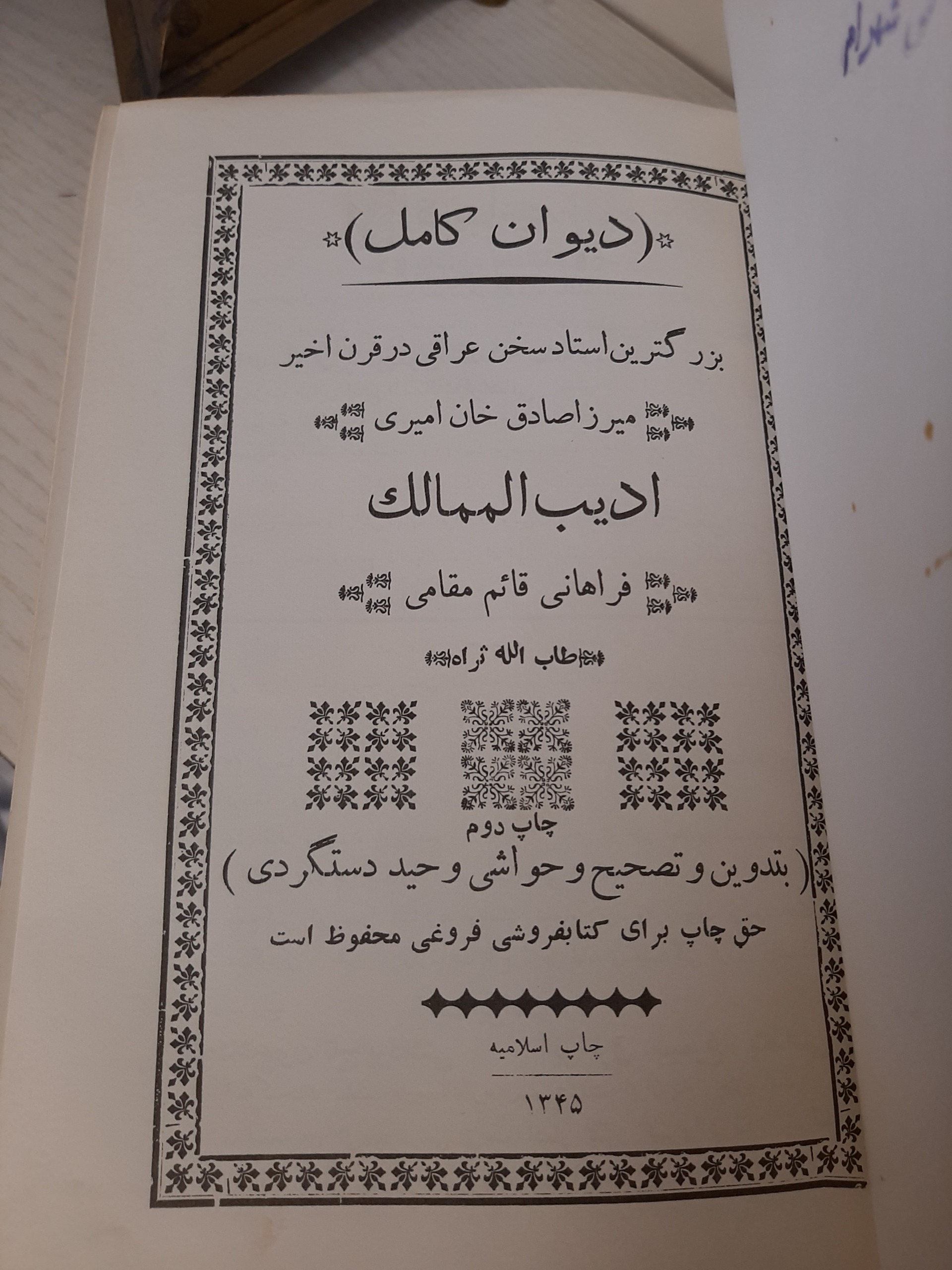 کتاب دیوان ادیب الممالک فراهانی به اهتمام وحید دستگردی در چاپ دوم سال هزار و سیصد و چهل و پنج توسط کتابفروشی فروغی منتشر شده است. این اثر شامل مجموعهای از اشعار ادیب الممالک فراهانی، شاعر و نویسندهٔ دورهٔ قاجار است که در قالب قصیده، قطعه، ترکیببند و هجویه به نگارش درآمدهاند. دیوان حاضر با تصحیح و حواشی استاد وحید دستگردی به چاپ رسیده و در آن، ضمن ارائهٔ اشعار، اطلاعاتی دربارهٔ زندگی و آثار ادیب الممالک نیز گنجانده شده است. این کتاب در قطع رقعی و جلد گالینگور منتشر شده و بهعنوان یک منبع معتبر در زمینهٔ ادبیات فارسی در دورهٔ قاجار شناخته میشود.