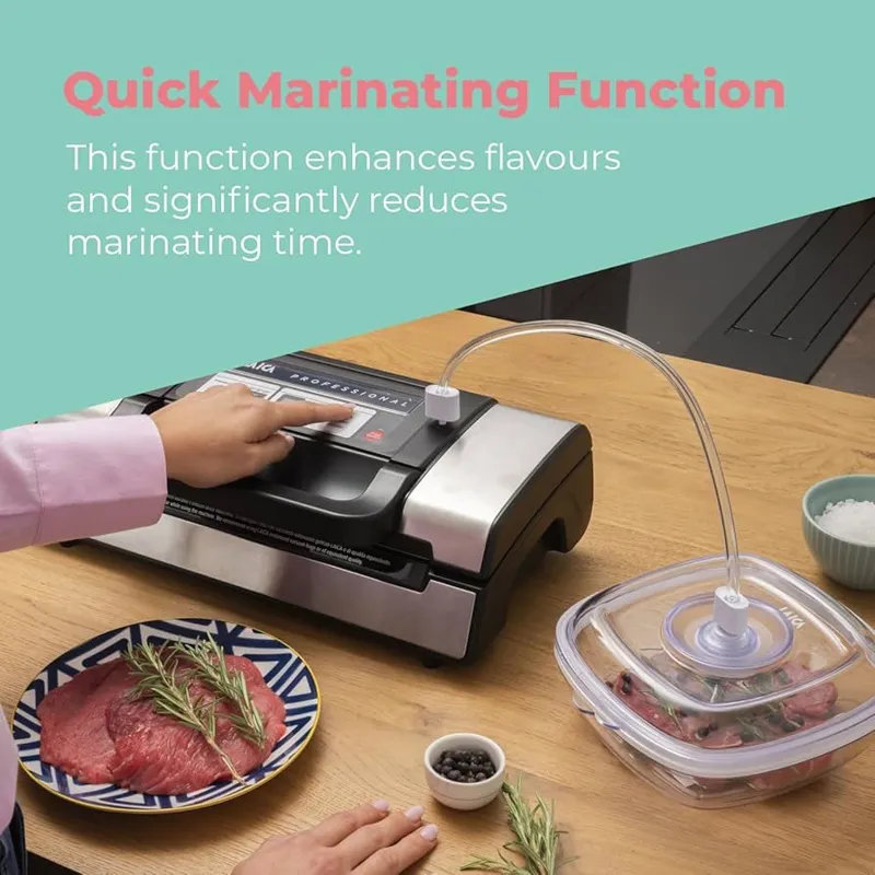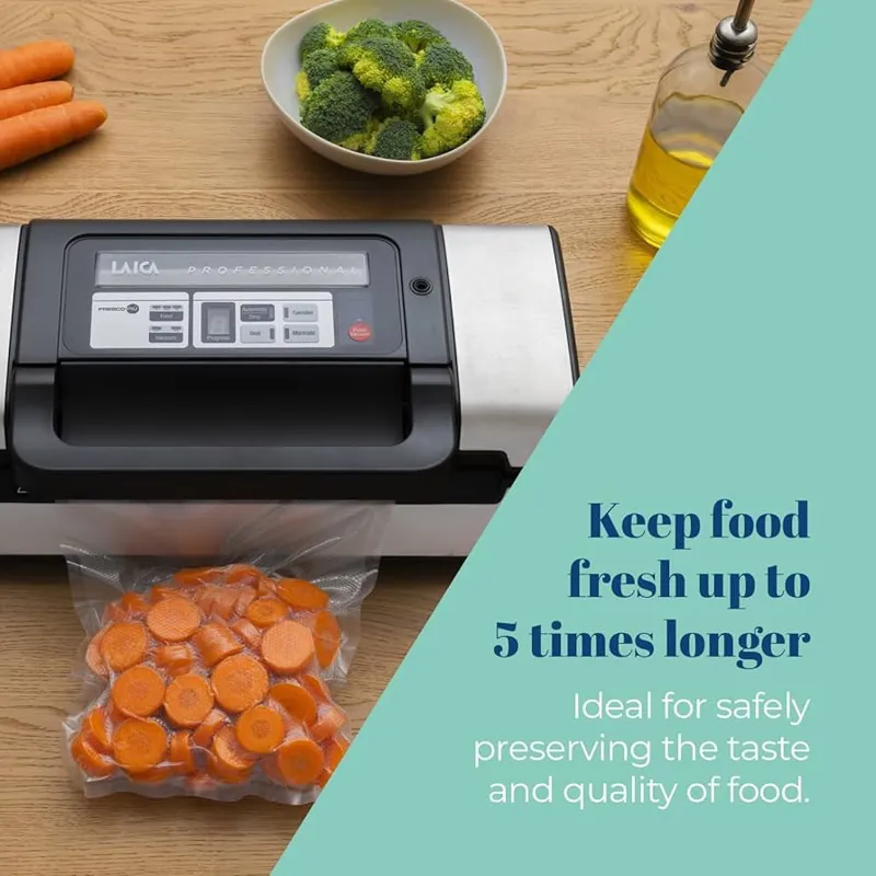 عملکرد سریع مارینت کردن: این سیلر راحت وکیوم مواد غذایی همچنین دارای عملکرد "مرینیت سریع" است که طعم را بهبود می بخشد و زمان مارین کردن را کاهش می دهد. راحتی و کارایی دستگاه های جاروبرقی VT3240 و کیسه های اضافی را در آشپزخانه خود تجربه کنید. کیسه های LAICA