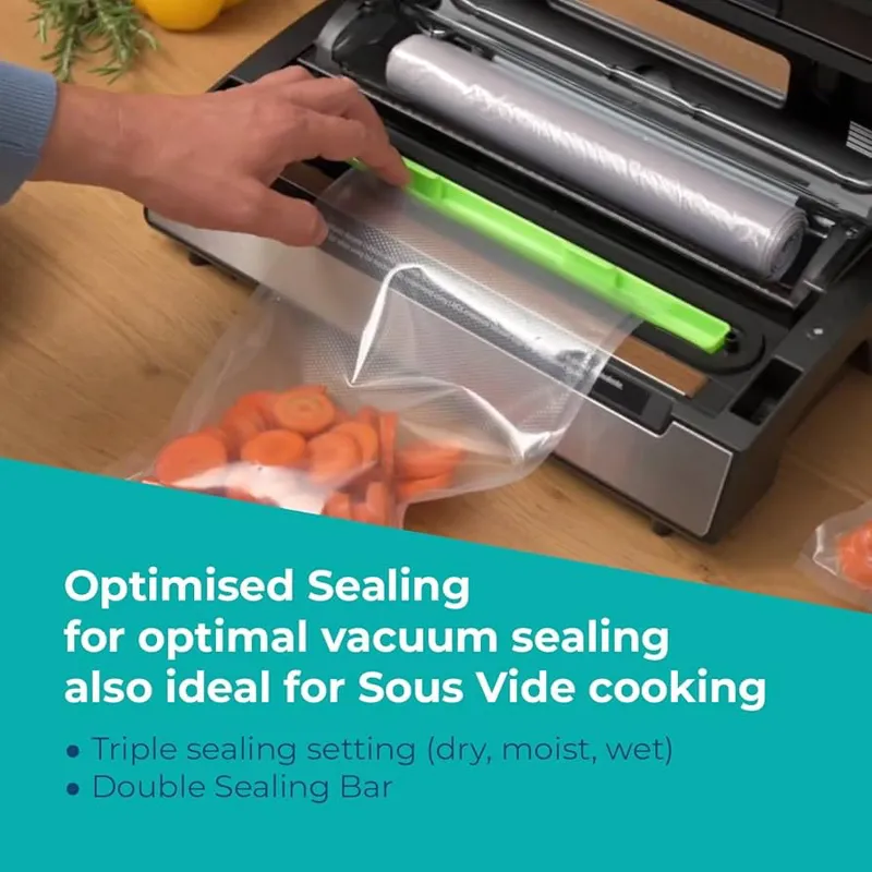 گزینه های آب بندی قابل تنظیم: این دستگاه پک vac قدرت مکش قابل تنظیم (معمولی - ملایم) و تنظیمات آب بندی سه گانه (خشک - مرطوب - مرطوب) را ارائه می دهد که آن را برای نگهداری انواع مواد غذایی با استفاده از کیسه های مهر و موم وکیوم و رول کیسه خلاء عالی می کند. دستگاه