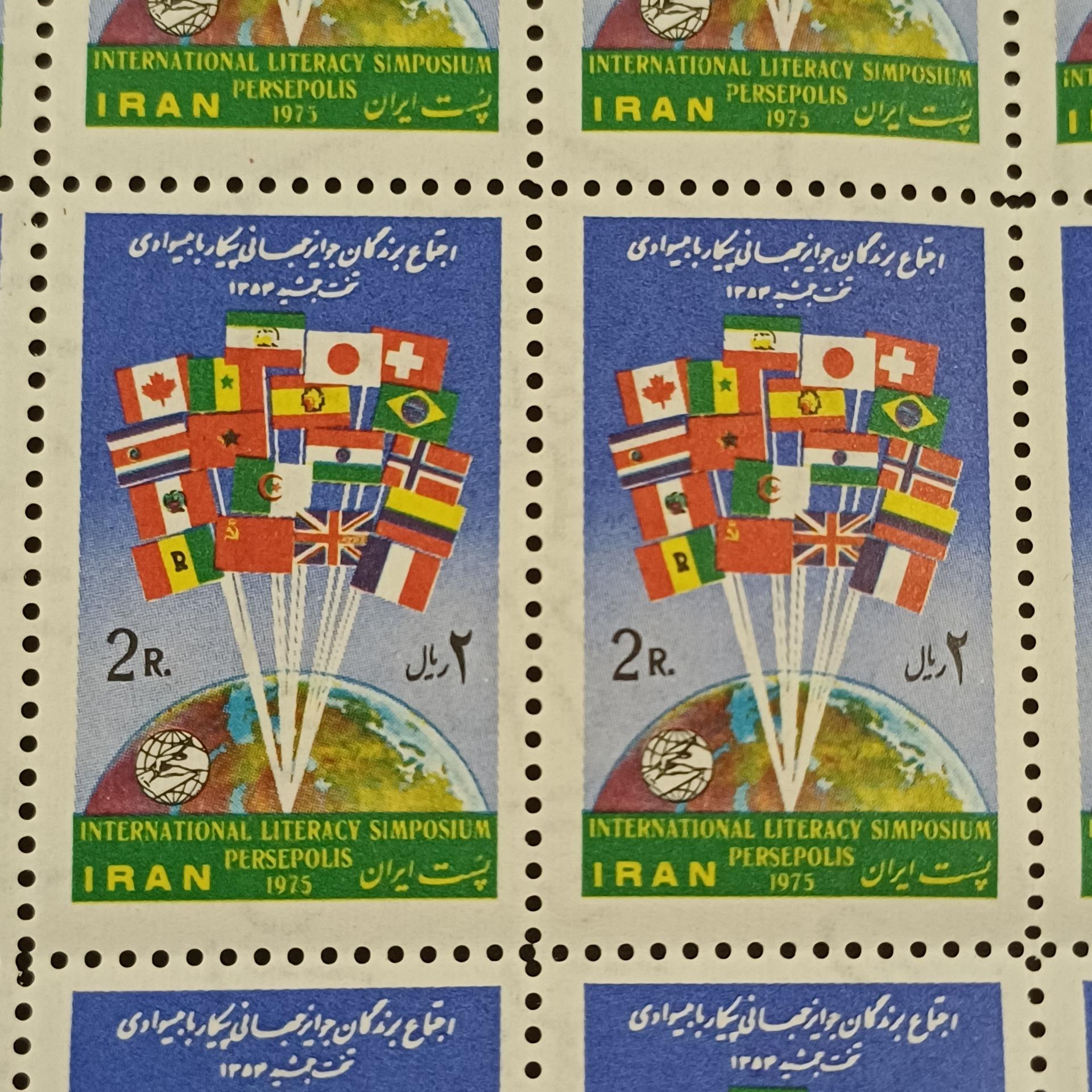 برگ کامل تمبر اجتماع برندگان جوایز جهانی پیکار با بیسوادی تخت جمشید 17 شهریور 1354 با ارم شیر وخورشید محمد رضا پهلوی