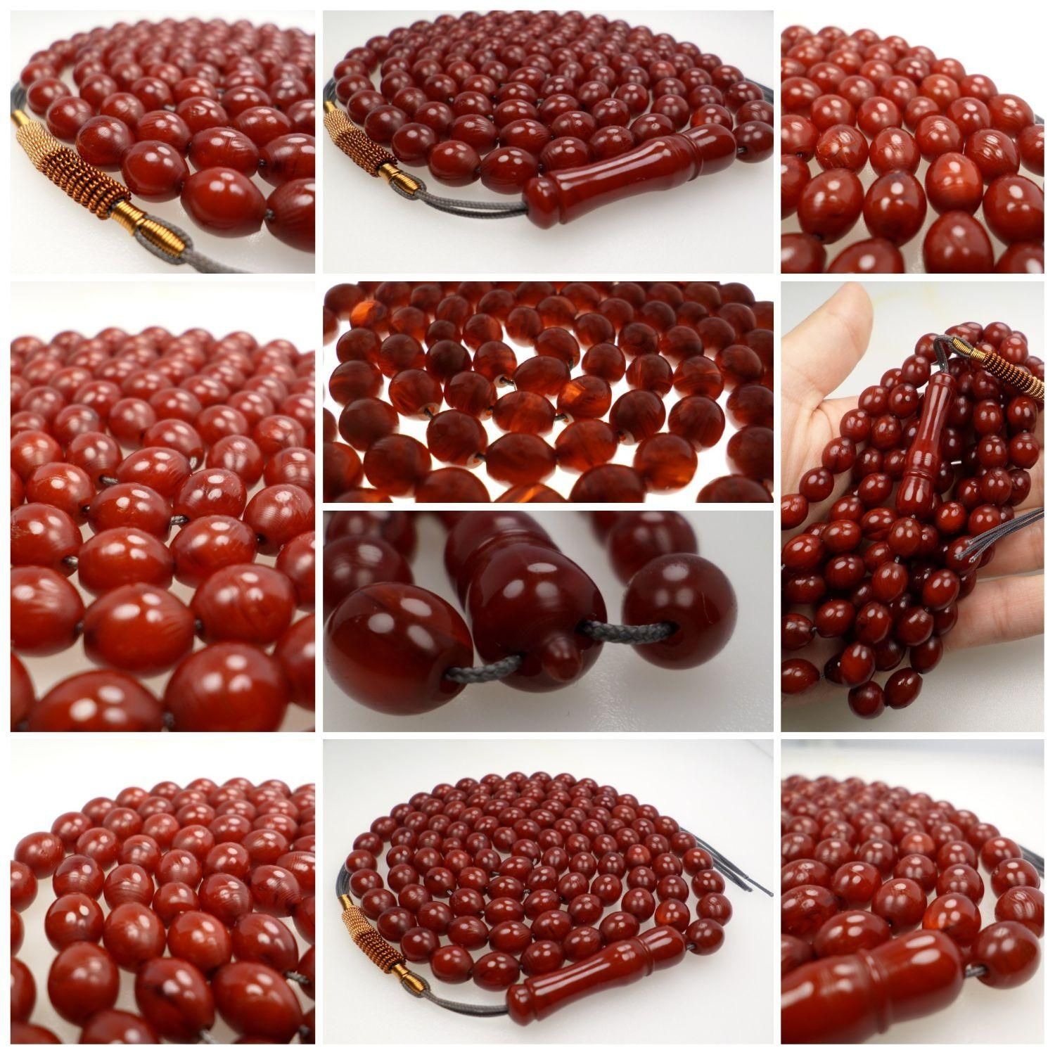 تسبیح فوق از بهترین متریال شمش کهربا با ظرافت و دقت بسیار بالا توسط اساتید کهن این هنر تراشیده شده و جزو نمونه های بسیار خاص تسبیح های هم رده خود میباشد .
