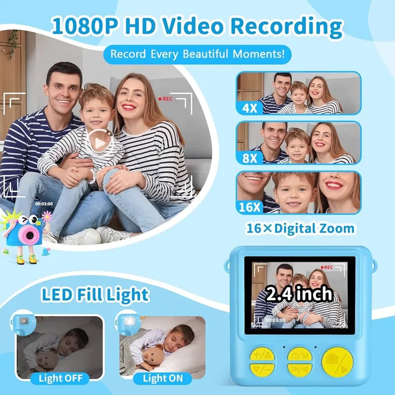 دوربین عکاسی کودک با قابلیت چاپ فوری، دوربین دیجیتال 2.4 اینچی 1080P HD با کاغذ چاپ و کارت حافظه 32 گیگابایتی، اسباببازیهای عکاسی، هدایای تولد برای پسران و دختران 3 تا 10 ساله
