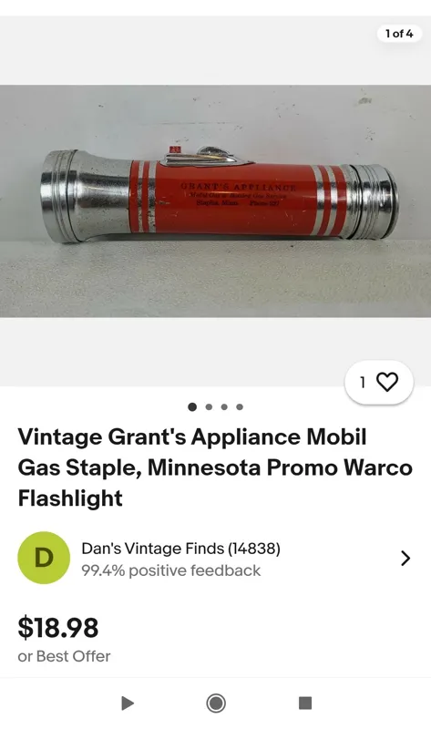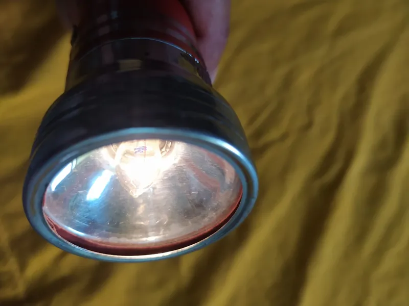 چراغ قوه قدیمی مدل کمیاب. کمی زنگ زدگی و پوسیدگی دارد. کلید قطع و وصل کنده شده ولی با شل و سفت کردن سری چراغ قوه خاموش و روشن میشود. قدمت دهه 50 میلادی. ساخت هنگ کنگ. کار با دو عدد باتری بزرگ. عکس آخر اینترنتی.