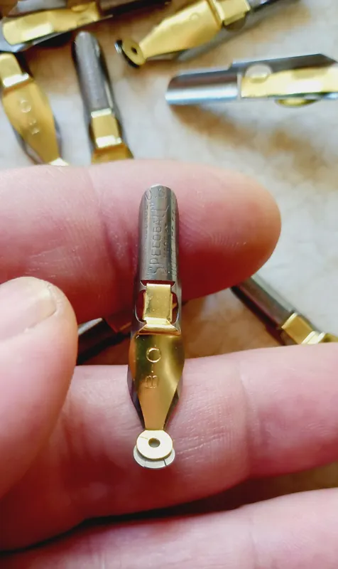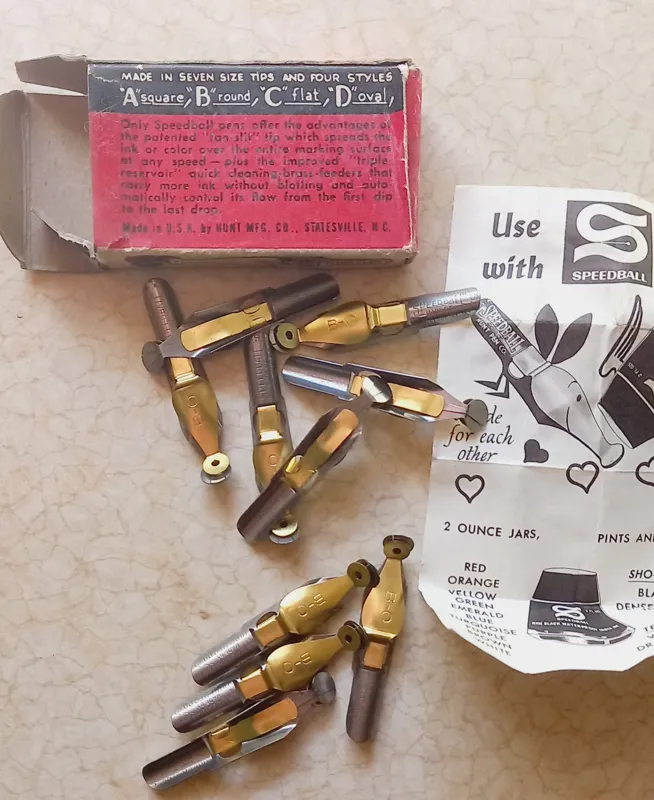 یک بسته 10 تایی سرقلم آمریکایی قدیمی کمیاب و کلکسیونی به شماره ای نوکB0 همراه برشور و جعبه ای فابریک خودش .این سرقلم ها جوری طراحی شدن که جوهر رو رو خودشون نگه دارن که استفاده کننده با هربار فرو کردن سرقلم در جوهر بتونه مثلا یکی دوخط اضافه تر بنویسه .و هی زود زود به جوهر نزنه در کل دقیقا مطابق تصاویر میباشد