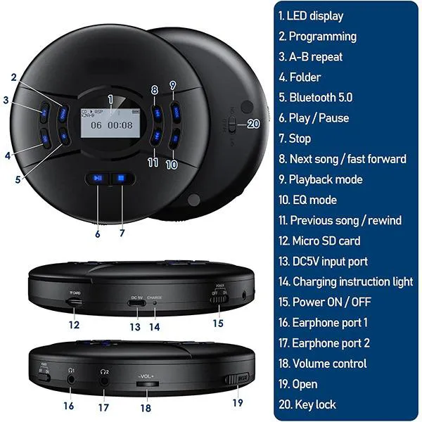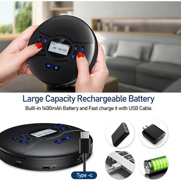 - باتری قابل شارژ 2000 میلی آمپر ساعتی: دیگر نیازی به استفاده از باتری های AA نیست یا همیشه شارژر را به پخش کننده سی دی وصل کنید. پخش کننده سی دی را می توان از طریق آداپتور DC 5V/1A، پاوربانک یا کامپیوتر با micro USB2.0 استاندارد با کابل شارژ Type-C شارژ کرد،