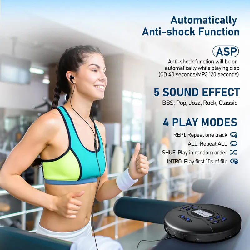 - سی دی پلیر ارتقا یافته: پخش کننده سی دی قابل حمل Gueray دارای بلوتوث داخلی و باتری قابل شارژ است، دارای دو حالت پخش سی دی و کارت TF است. - چندین ویژگی مدرن وجود دارد. ASP: حفاظت ضد ضربه برای جلوگیری از قطع پخش CD در صورت لرزش.