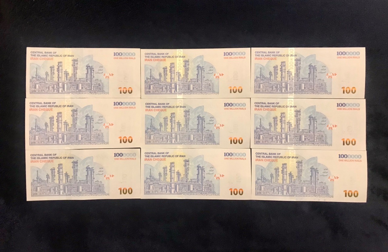 9 برگ تراول چک یک میلیون ریالی یا صد هزار تومانی با تصویر تخت جمشید و امضای قرمز همتی تا نخورده و کلکسیونی طبق تصویر