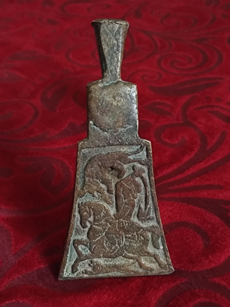 توضیحات : تیشه برنجی زیبا با نقش شمشیر زن اسب سوار بر روی تیشه و نقش گل مرغی در زیر تیشه و نقش های زیبا بر روی دسته