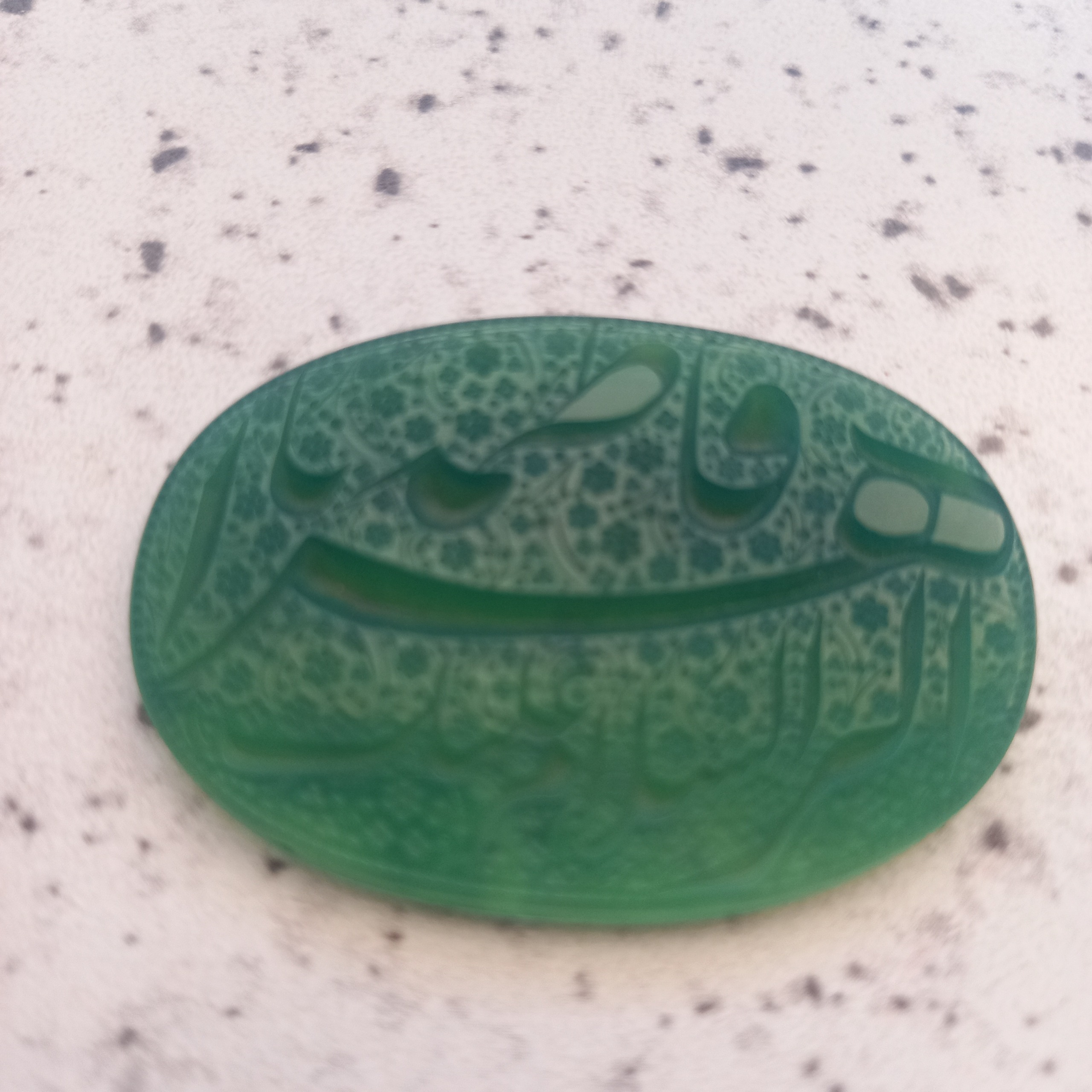 گردن آویز خطی با ذکر یا فاطمه الزهرا سلام علیک از جنس عقیق سبز انداز نگین یا گردن آویز 5×3/5 سانتی متر