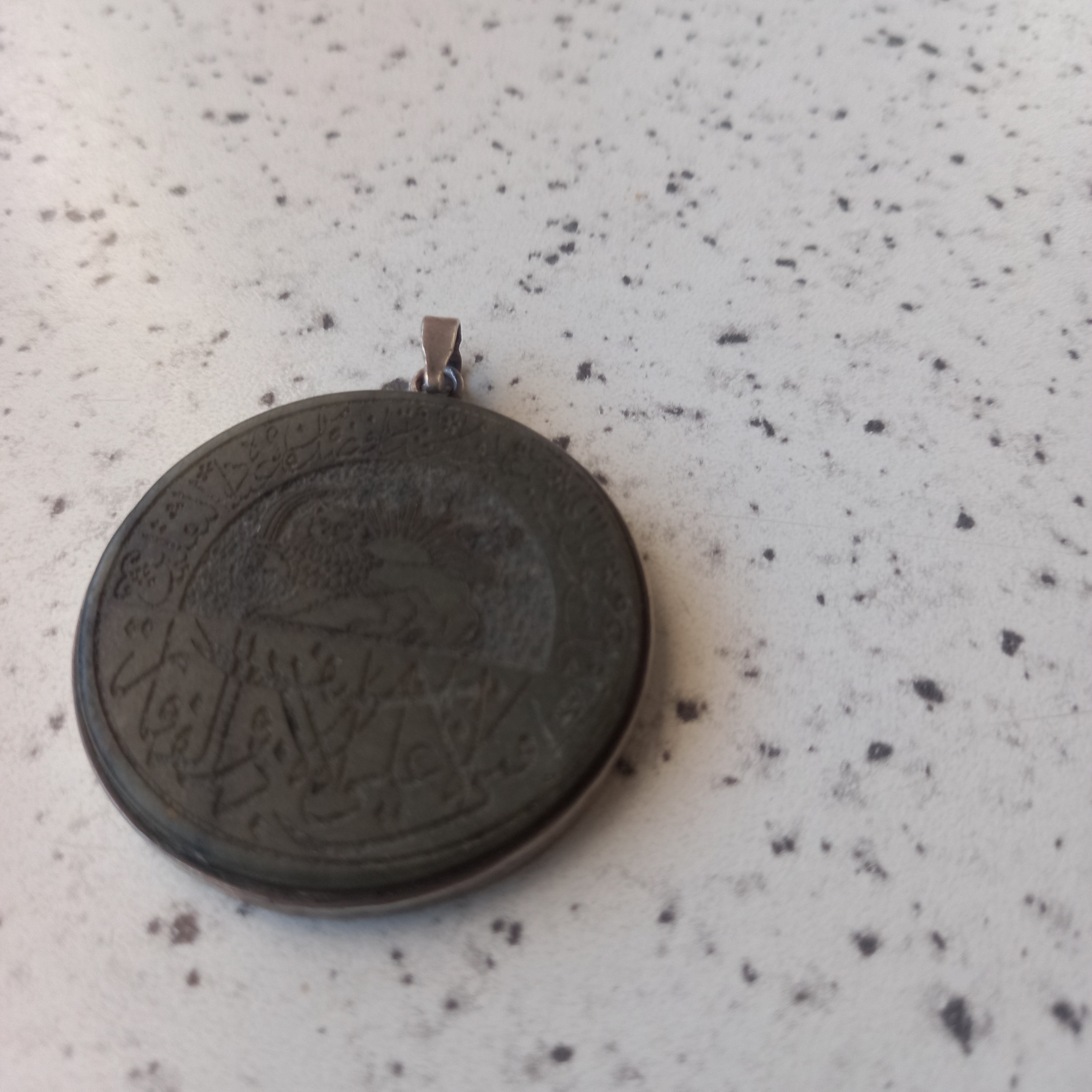 گردنبند یا مدال اویز از جنس یشم عباس آباد با قاب نقره گرفته شد و تصویر شیر و خورشید و ذکر آیا لافتی الله علی و همچنین آیا در دور بالا حکاکی شده فوق العاده قدیمی و کهنهذ