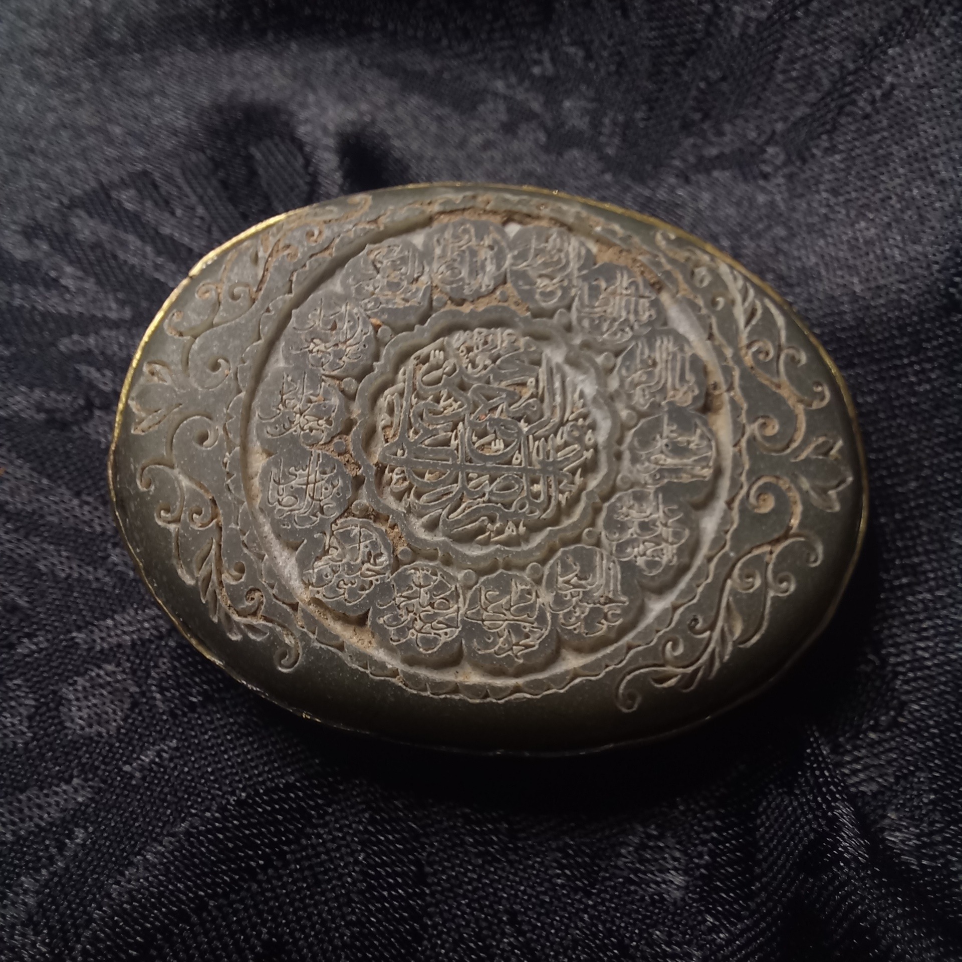 گردنبند حکاکی شده بسیار بسیار کهنه گبری از جنس یشم و حکاکی منحصر و باستانی و گبری قاب شده با آلیاژ زمان خودش،محافظت از شر و بلایا