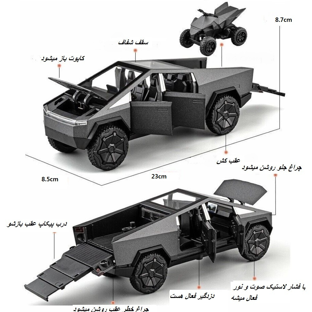 ماشین فلزی تسلا سایبر تراک شش در بازشو با موتور آفرود بزرگ 1/24 چراغدار و موزیکال
