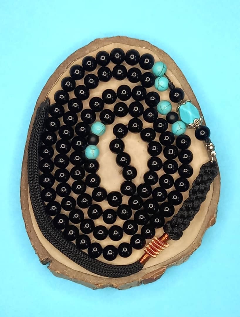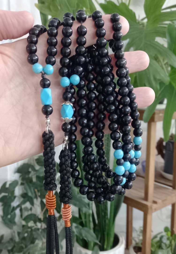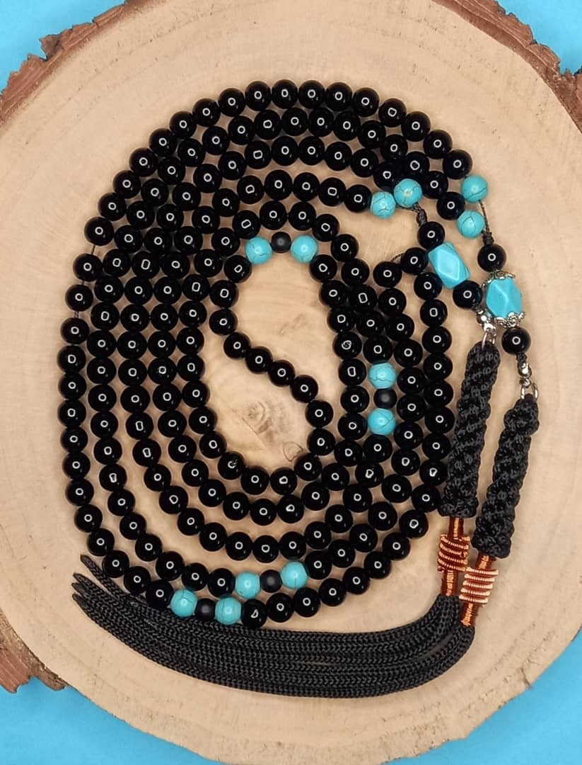 #تسبیح_اونیکس مشکی براق 101 دانه   8 میل یک سنگ صنعتی زیبا با تزیین فیروزه صنعتی یک ترکیب چشم نواز  ، زیبا ،اقتصادی و خوش دست قابل  استفاده برای خانم ها و آقایان و مناسب برای #کادو و افراد دائم الذکر .