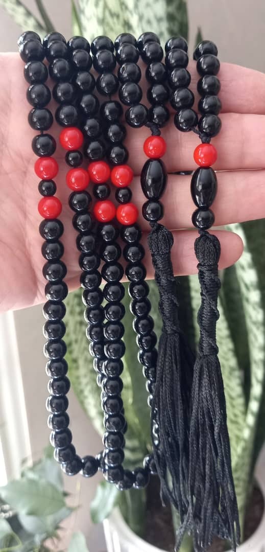 #تسبیح_اونیکس مشکی براق 101 دانه 8 میل یک سنگ صنعتی زیبا با تزیین مرجان انرژی بخش یک ترکیب چشم نواز ، زیبا ،اقتصادی و خوش دست قابل استفاده برای خانم ها و آقایان و مناسب برای #کادو و افراد دائم الذکر .