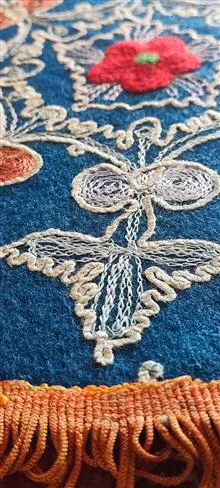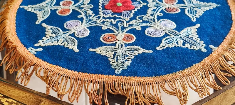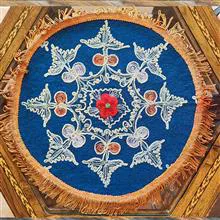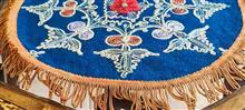 رومیزی گرد رشتی دوزی کهنه به رنگ آبی و قطر 37 سانتیمتر تقدیم نگاه زیبا پسندتان.