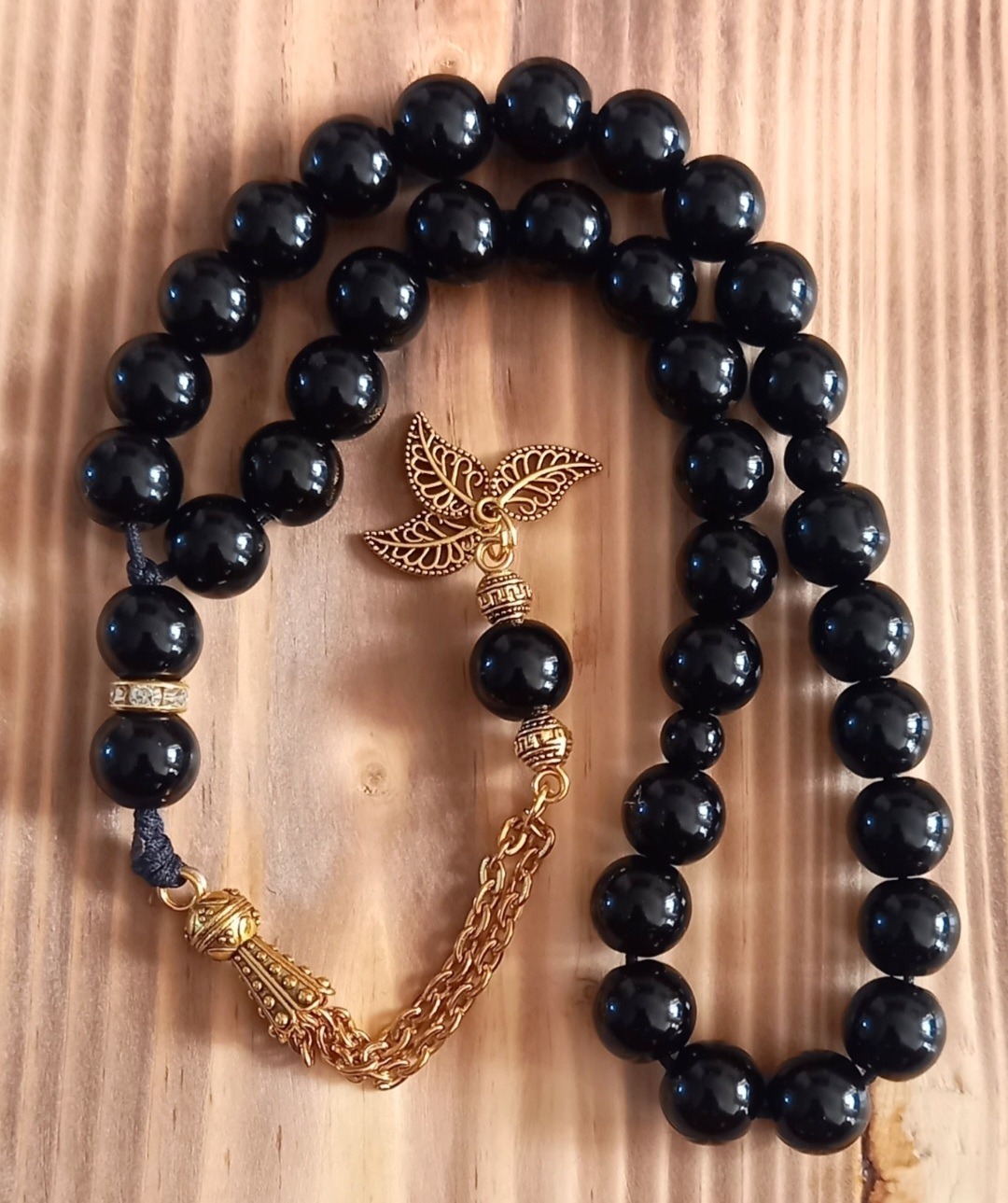 تسبیح اونیکس 33 دانه براق 10 میلیمتر با آویز فلزی
