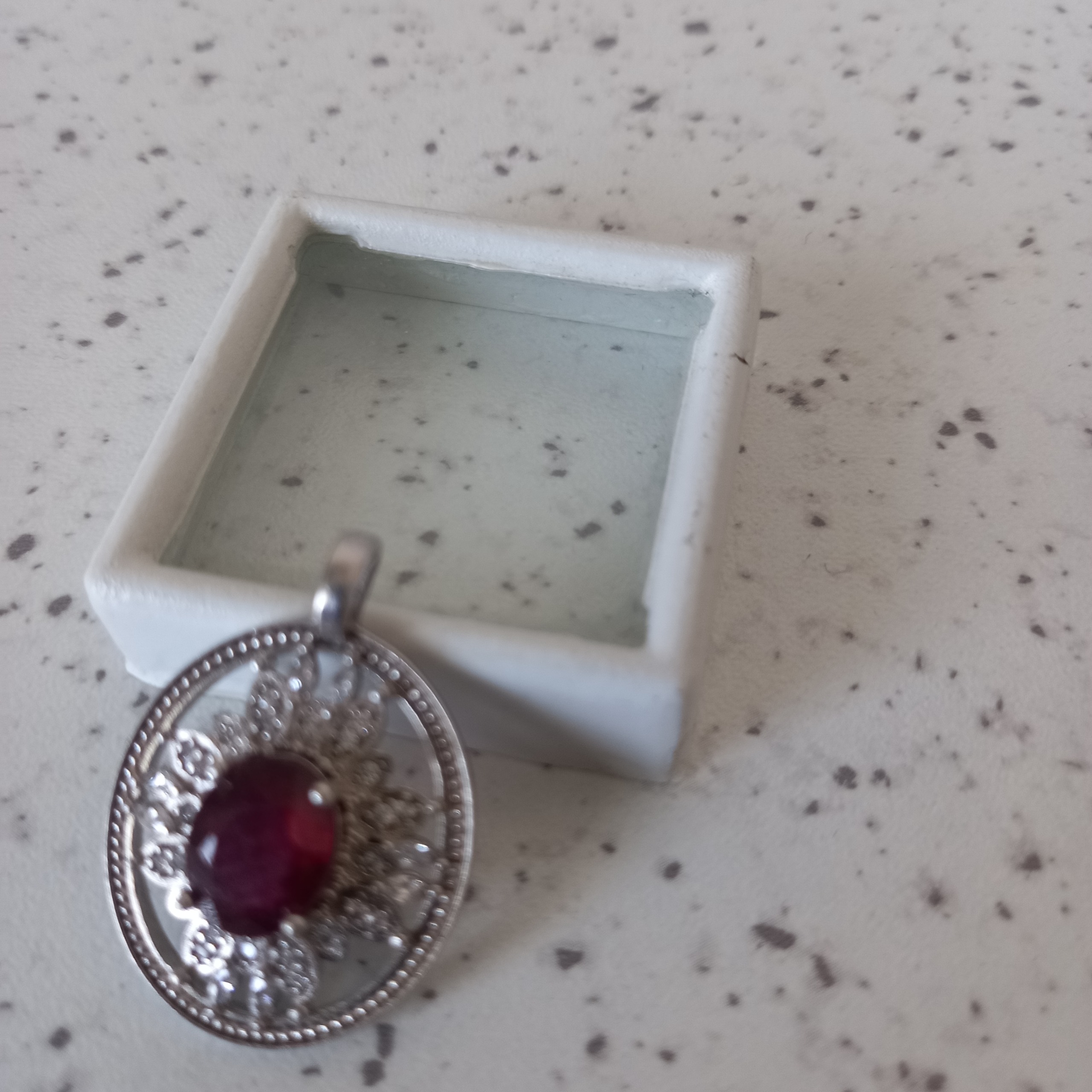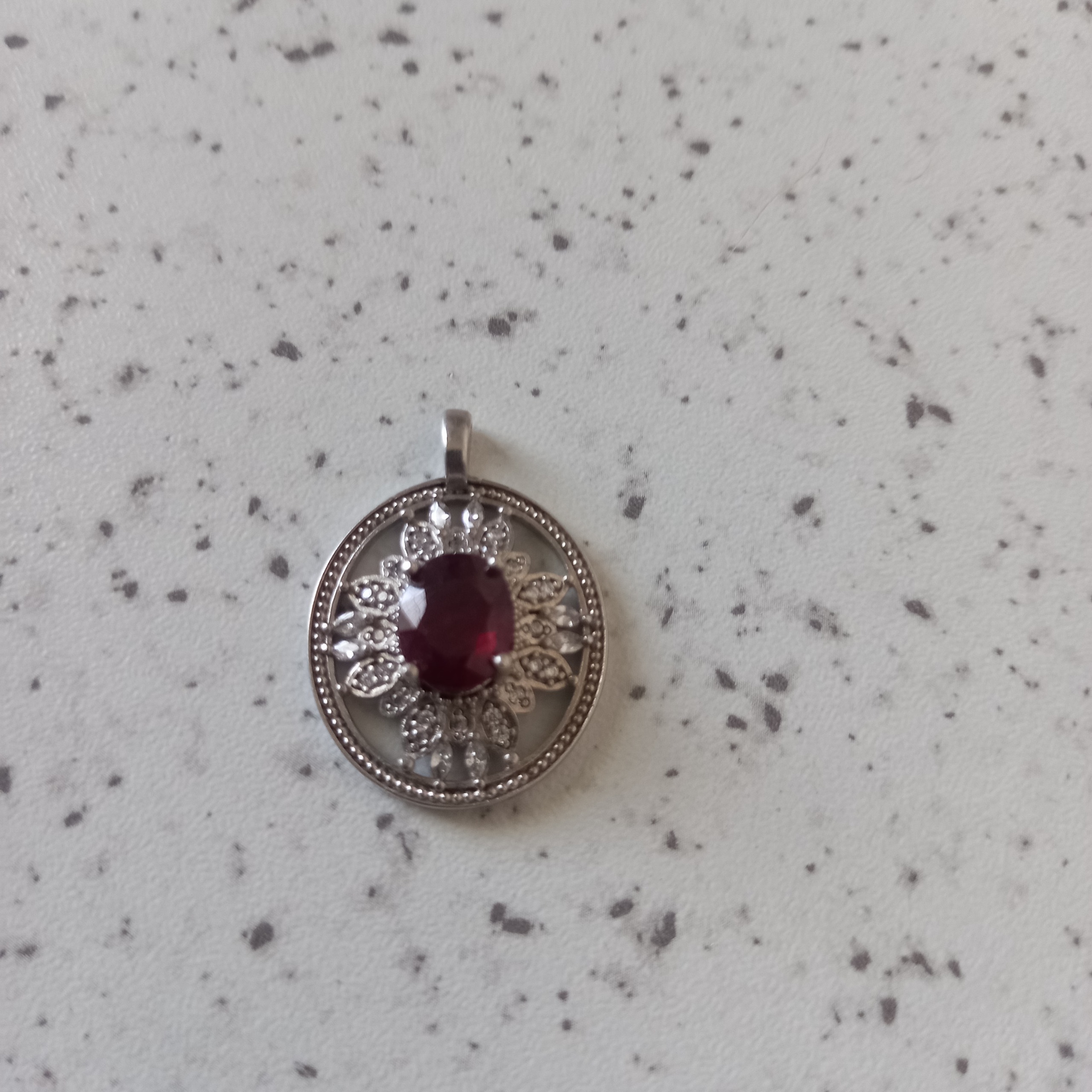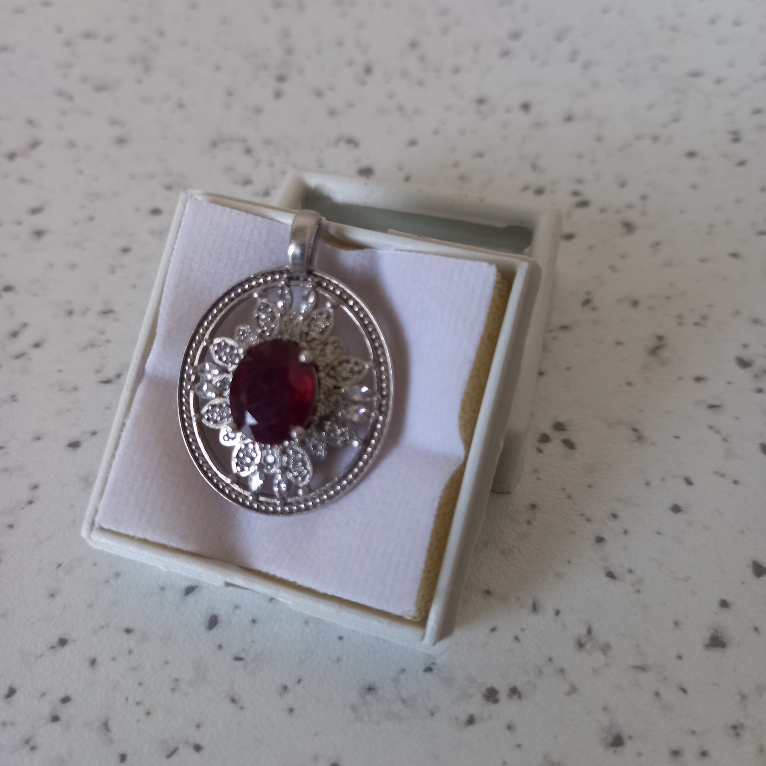 یک عدد گردنبند دست ساز فوق العاده ظریف ساخت با تزئینات از سنگ جواهری در اطراف با نگینی از یاقوت اصل برمه بسار ارزشمند و زیبا