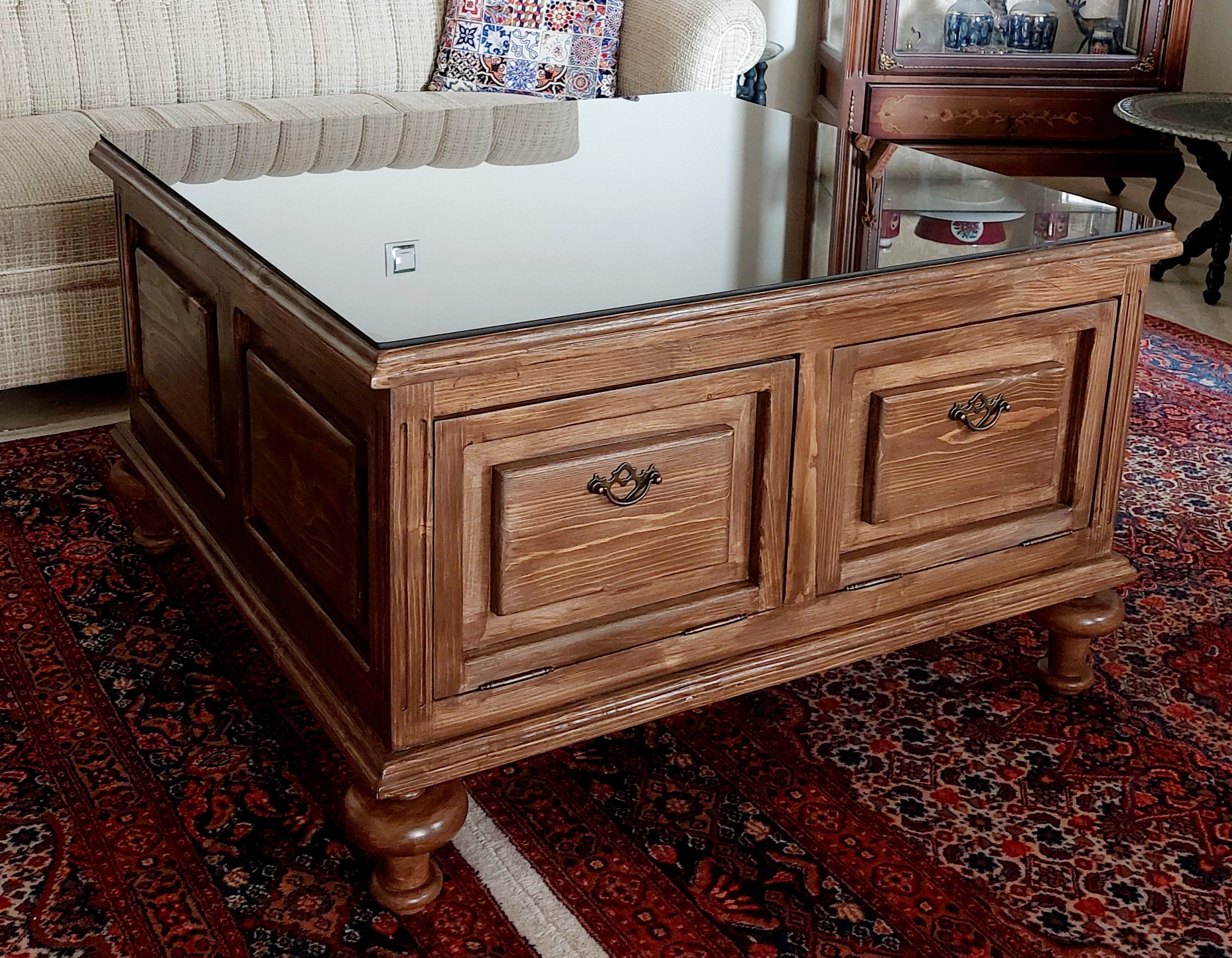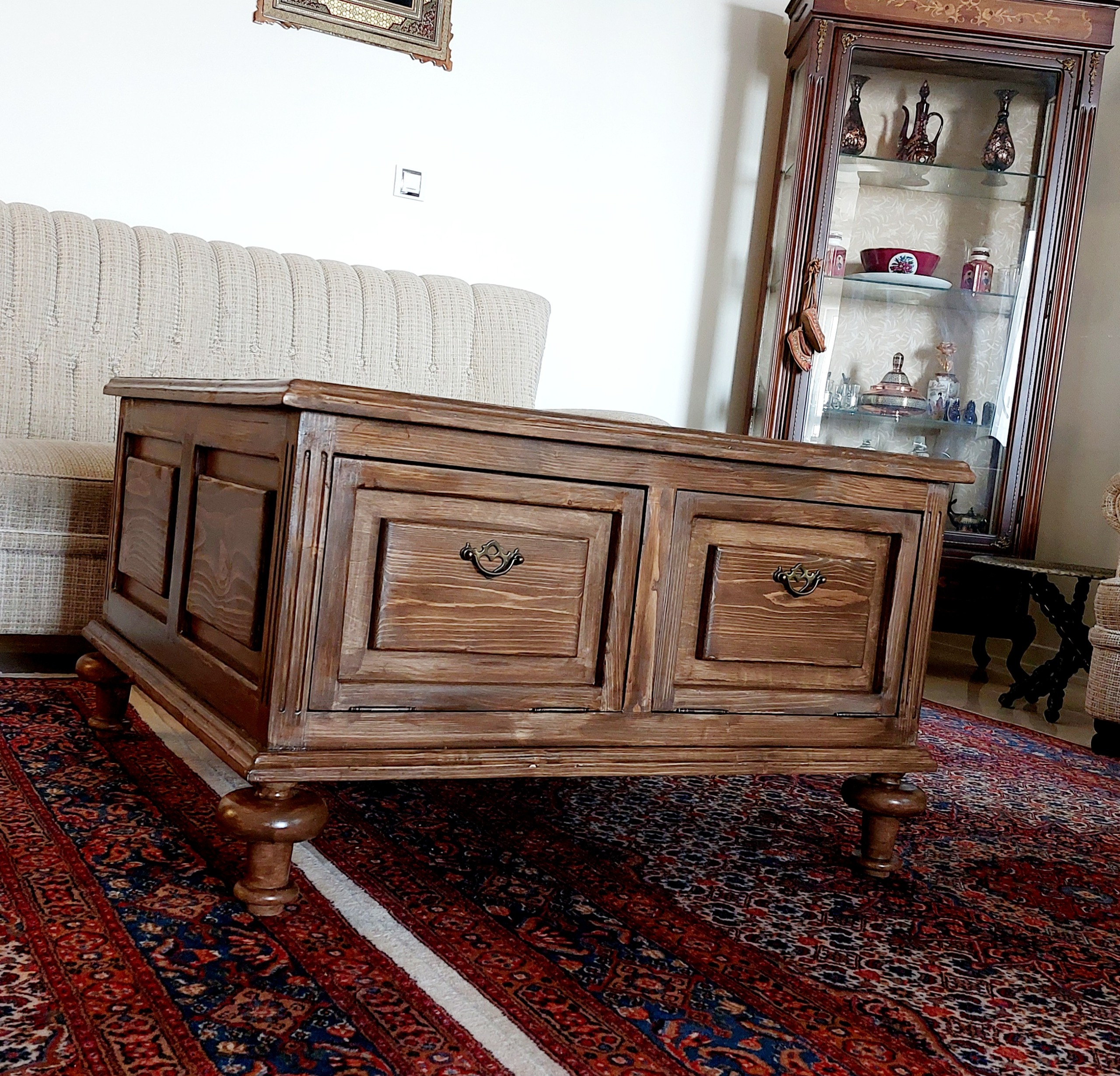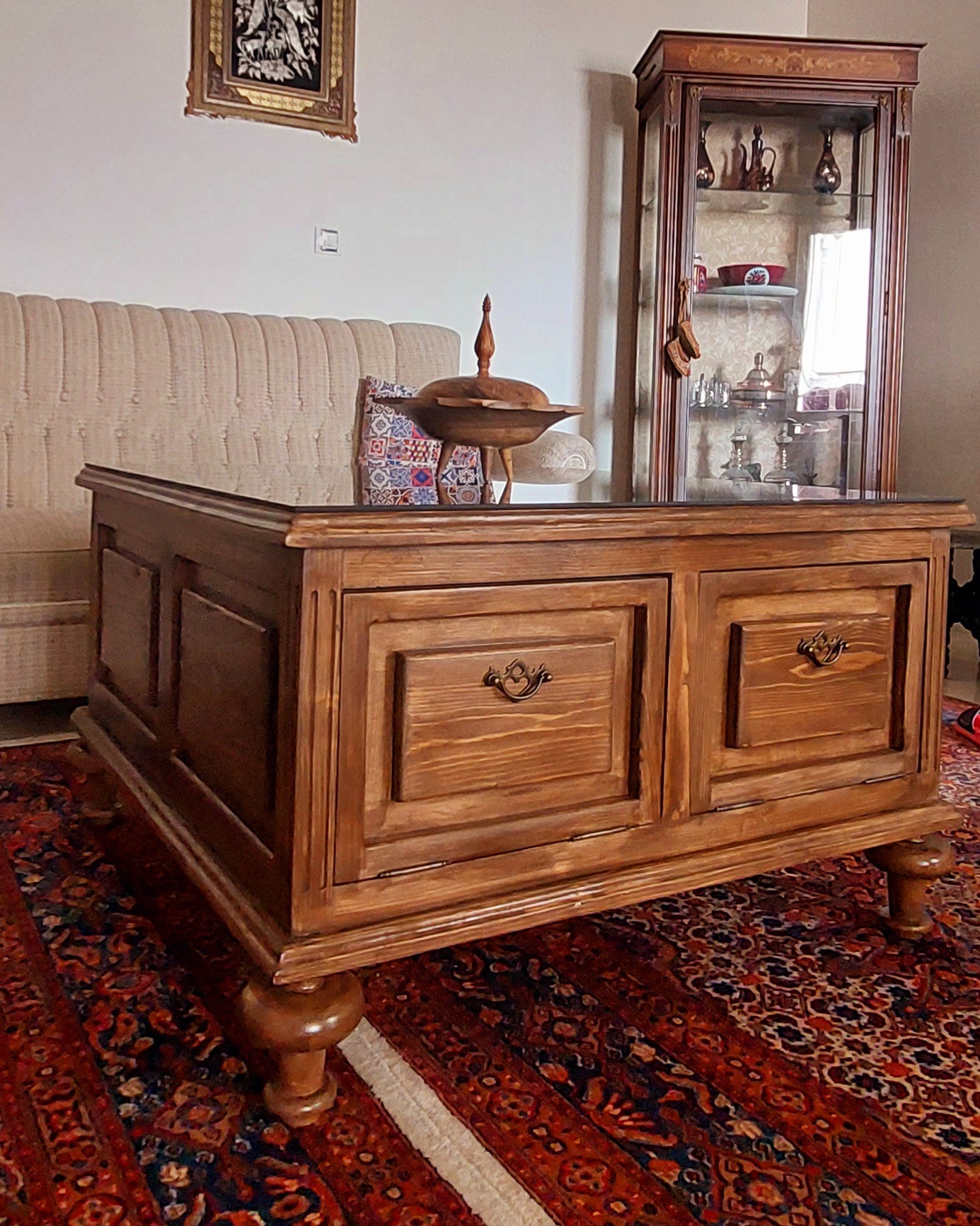 میز جلو مبلی تمام چوبی ساخته شده از چوب روسی. بسیار خوش نقش و ظریف ساخت. پایه ها خراطی از چوب راش، دو کشو و دو کمد جادار. 90 در 90 سانت. دارای شیشه روی میز. فقط یکی ساخته شده است.