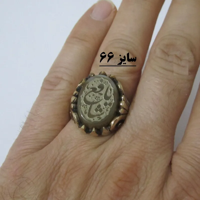 انگشتر مردانه با رکاب طلا روسی و کتیبه عقیق اصل با حک برجسته ذکر «یا شافع» طبق تصویر (1398). ابعاد سنگ 1.5 در 2 سانتیمتر است؛ سایز انگشتر 66 است (قطر داخل انگشتر 20.9 میلیمتر است). رکاب این انگشتر، آلیاژی از مس و روی است که با نام طلا روسی شناخته می شود. توجه فرمایید دقیقا همین محصول که در تصویر می بینید برای مشتری ارسال خواهد شد. خواهش می کنم برای اطلاع از زمان دقیق دریافت بسته با اداره پست منطقه ای تماس بگیرید.