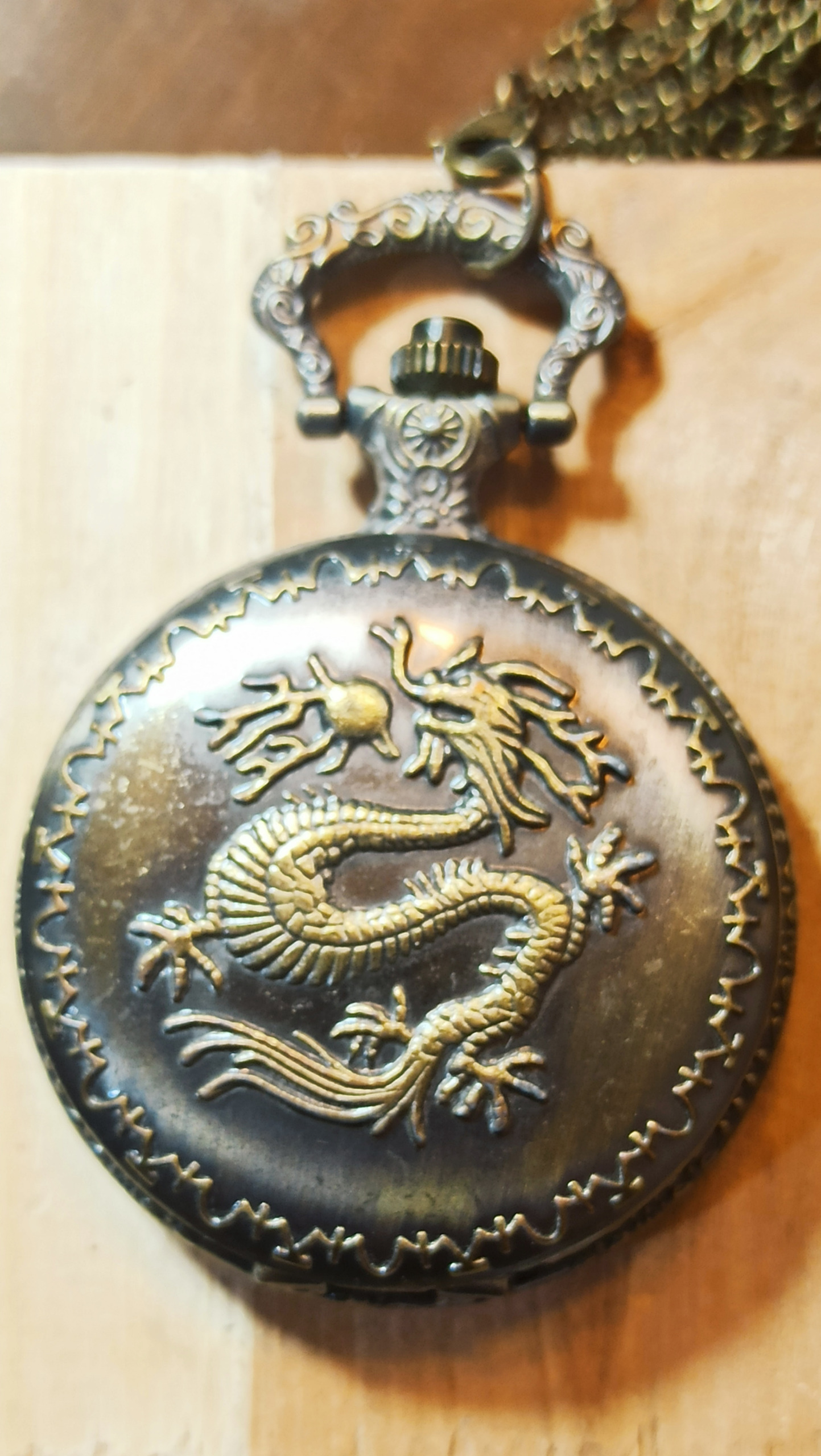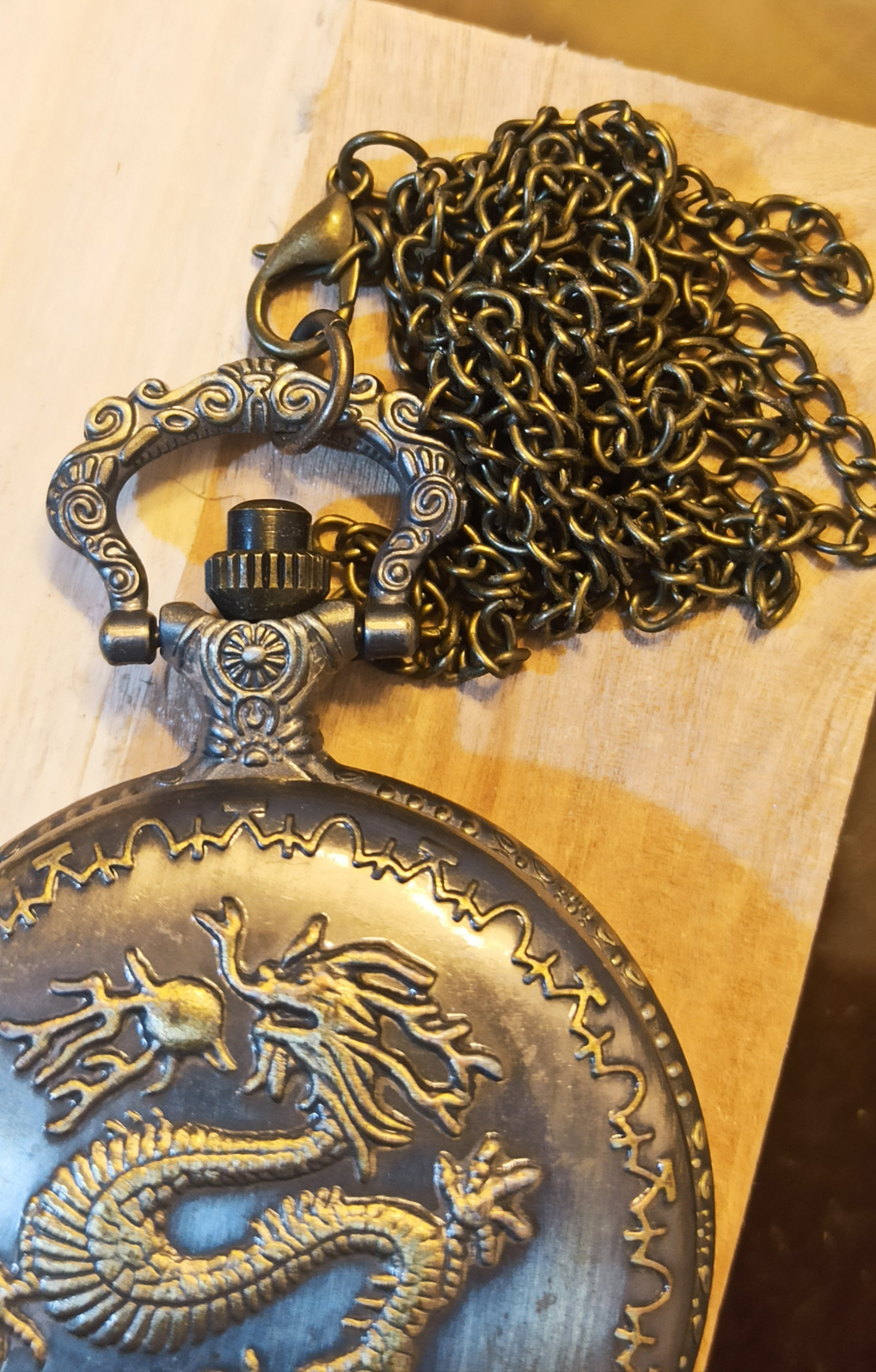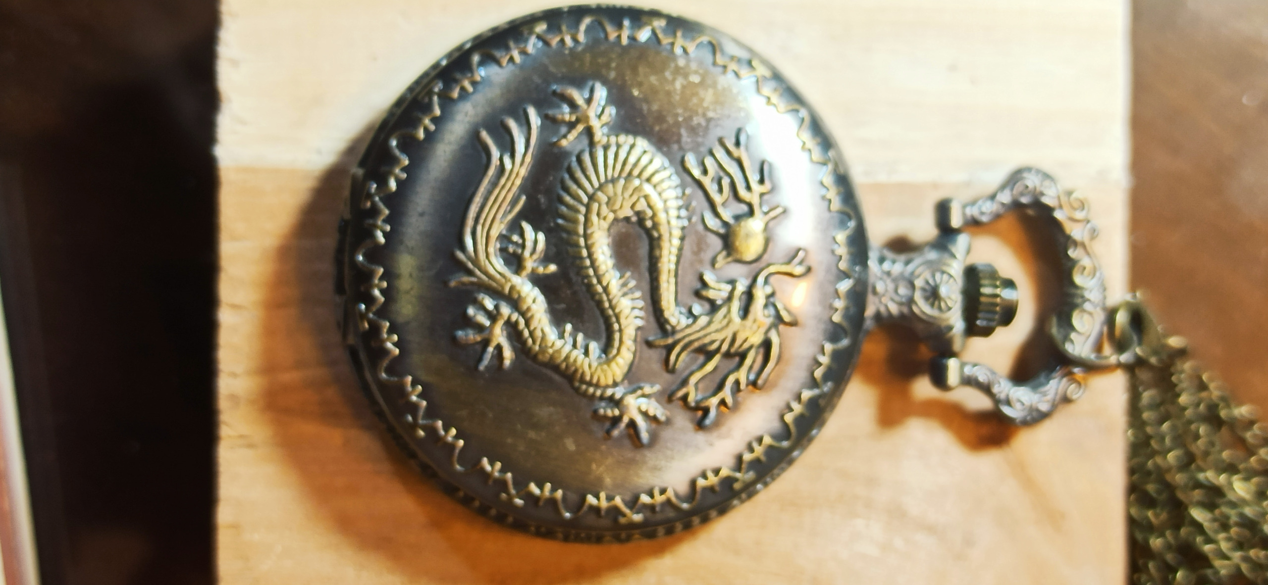 ساغت جیبی آویز سایز بزرگ قدیمی نقش اژدها صفحه درشت نقش برجسته