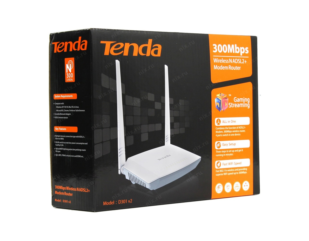 مودم روتر «D301v2» محصولی از برند «تندا» (Tenda) است. این محصول می تواند در نقش چند دستگاهِ کاربردی شبکه انجام وظیفه کند و نقش یک مودم و روتر باسیم و بی سیم را بر عهده داشته باشد. با این دستگاه می توانید یک مودم ADSL2+، یک روتر بی سیم و یک سوییچ چهار پورت را در یک محصول در اختیار داشته باشید. داشتن قابلیت هایی همچون USB Sharing، IPTV، نصب آسان و TR069 بر ارزش این محصول افزوده است. مودم روتر D301v2 از استاندارد بی سیم IEEE 802.11n پشتیبانی می کند و سرعت انتقال بی سیم تا 300 مگابیت بر ثانیه را به همراه میآورد. این پهنای باند برای دسترسی بسیار سریع به اینترنت، تماشای ویدئوی آنلاین، استفاده از سرویس های استریمینگ، بازی های آنلاین و اشتراک گذاری فایل کاملا جوابگوست. شبکه بی سیم این مودم توسط 2 عدد آنتن خارجی با قدرت 5dBi ایجاد می شود و می تواند تمام مساحت یک منزل مسکونی را پوشش دهد. مودم D301v2 با در اختیار داشتن فناوری MIMO از بازتاب های سیگنال بی سیم برای کاهش نقاط کور بی سیم استفاده می کند و عملکرد بهتر شبکه بی سیم، نرخ انتقال خوب، پایداری سیگنال و پوشش دهی بالا را به همراه می آورد. در پشت دستگاه، یک پورت USB 2.0 وجود دارد که امکان اتصال فلش مموری یا هارد اکسترنال به D301v2 را فراهم می کند. با استفاده از این پورت میتوانید فایل های موجود در حافظه جانبی را درون شبکه و با کاربران حاضر در شبکه بی سیم به اشتراک بگذارید. این مودم روتر در برابر صاعقه هم مقاوم است و می تواند ولتاژی تا 6000 ولت را تحمل کند. مقاومت D301v2 در برابر صاعقه، آن را برای استفاده در مناطقی که دچار صاعقه های مکرر می شود، مناسب کرده است.