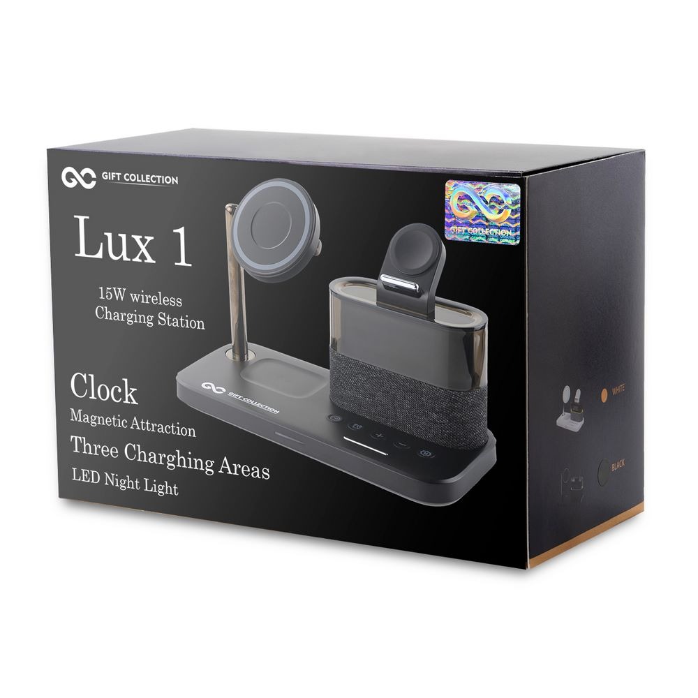 پایه شارژر بیسیم 5 کاره با توان 23 وات گیفت کالکشن مدل LUX 1 و قابلیت شارژ همزمان چند دستگاه، یک انتخاب حرفهای برای کاربران گوشی های آیفون , سامسونگ و سایر گوشی هایی که از شارژر بی سیم پشتیبانی می کنند. علاوه بر این قابلیت شارژ اپل واچ و ایرپاد را نیز دارد. پایه شارژر بیسیم LUX 1 علاوه بر شارژ بیسیم ، دارای ساعت دیجیتال و چراغ خواب LED نیز هست و با حذف کابلهای اضافی ، نظم و زیبایی را به میز کار یا میز خواب شما هدیه میدهد. این پایه شارژ مغناطیسی با بهرهگیری از فناوری پیشرفته QI سرعت شارژ را نسبت به شارژرهای معمولی افزایش میدهد و محافظت در برابر ولتاژ بالا ، اتصال کوتاه و جریان بیش از حد را فراهم میسازد تا ایمنی کامل در هنگام شارژ را تضمین کند.برای شارژ دستگاه از آداپتور های قوی 20 وات به بالا استفاده نمایید.