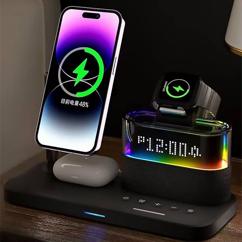 ویژگی 5 در 1 شارژ موبایل _ شارژ اپل واچ _ شارژ ایرپاد _ ساعت دیجیتال _ چراغ خواب LED