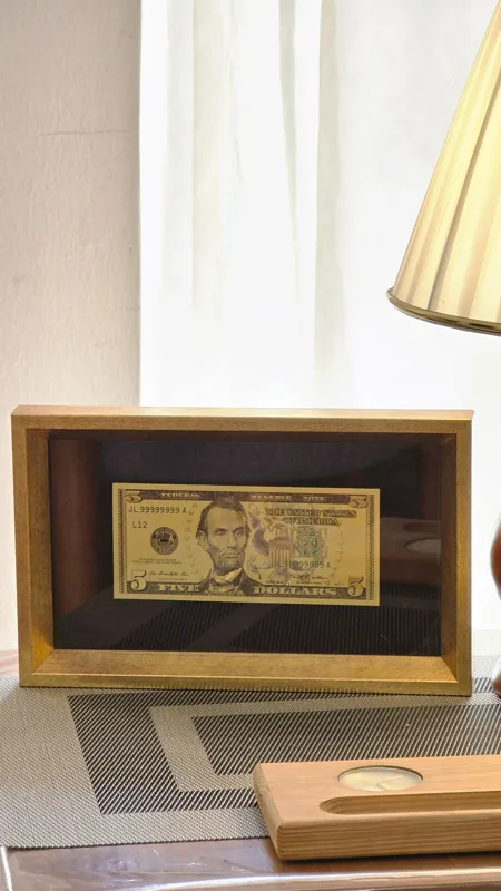 تابلوی دکوراتیو روکش طلا، ترکیبی هنرمندانه از اسکناس دلار و طرحهای درهم، انتخابی خاص برای کسانی که به دنبال جلوهای لاکچری و متفاوت در دکوراسیون خود هستند.