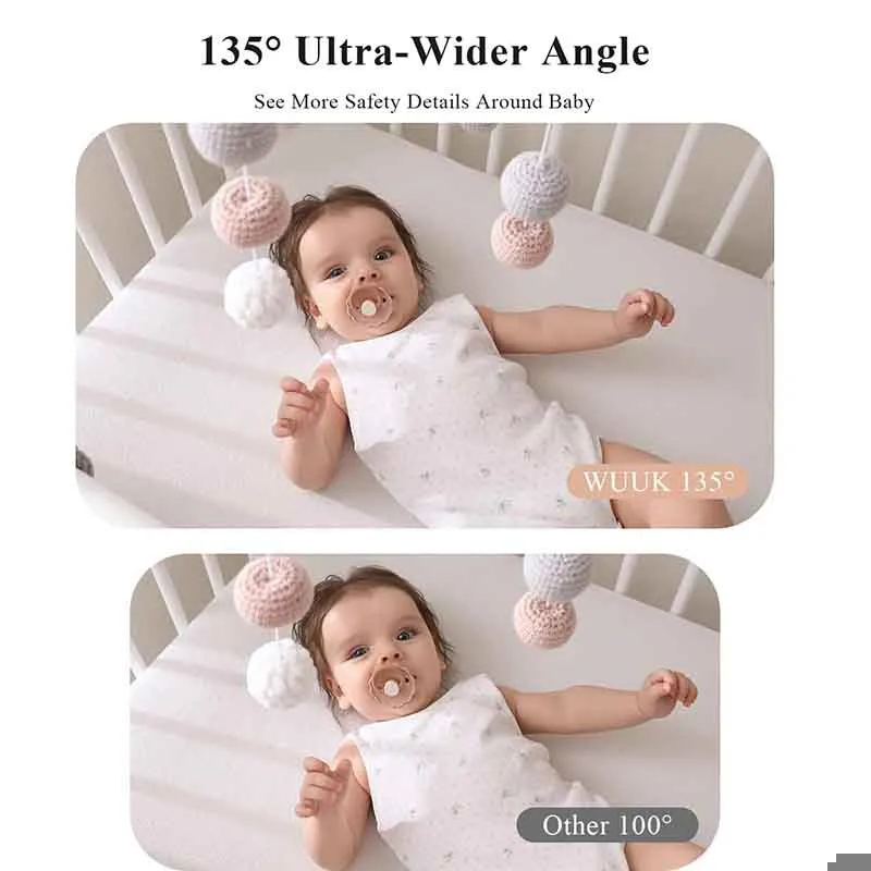 جزئیات بیشتر را در صفحه نمایش بزرگتر و عریضتر ببینید مانیتور کودک WUUK WiFi به لنز با زاویه دید 135 درجه است، تصویر تصویر را روی صفحه 5.5 اینچی یا برنامه تلفن همراه WALK در مقایسه با دوربینهای با زاویه 100 درجه بررسی کنید. با چرخش افقی 355 درجه، چرخش عمودی