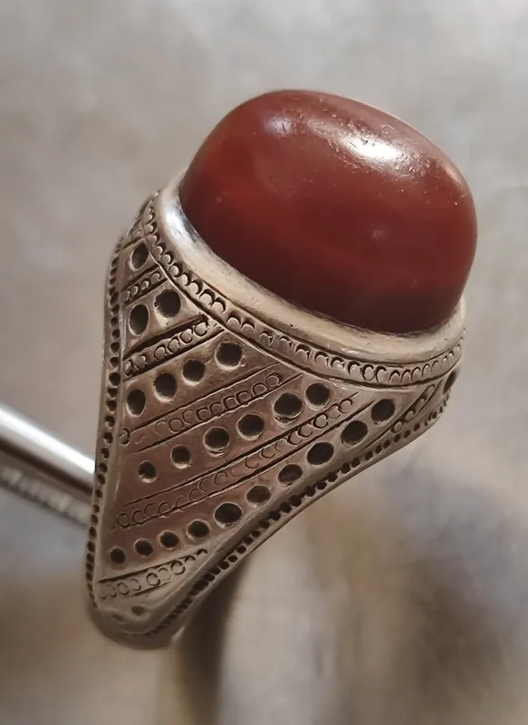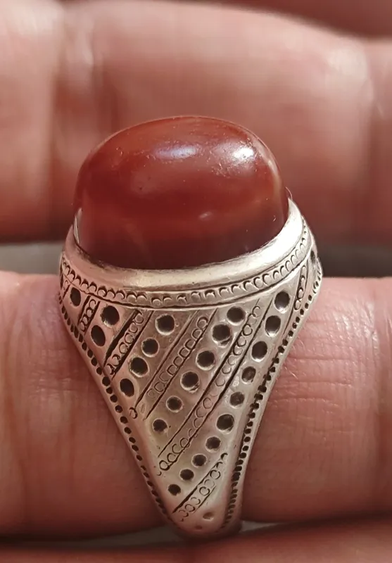 انگشتر دست ساز قدیمی و کهنه عقیق یمن کبدی طوق دار و سمبه دار