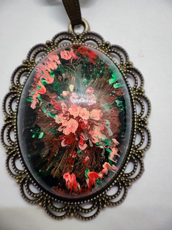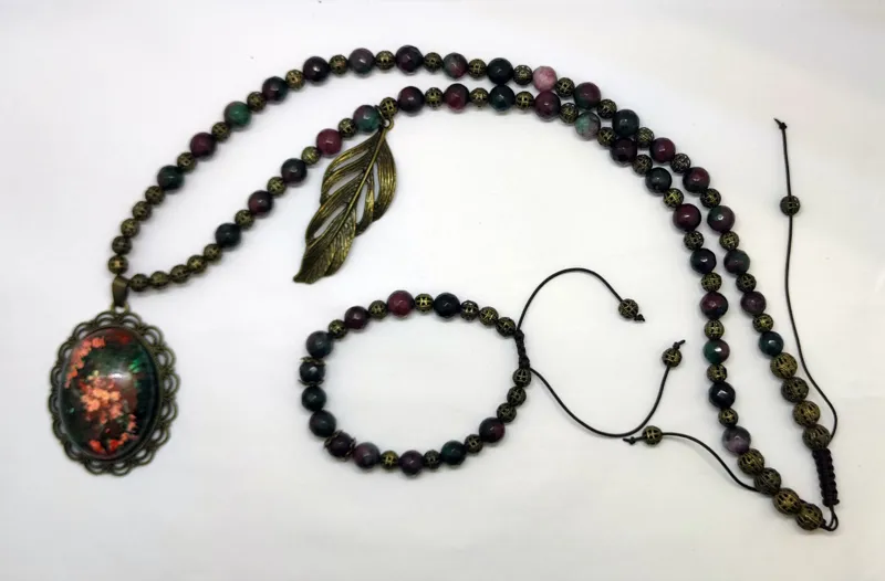 ست زیبای شمعدونی با همان خاطرات نوستالوژی کودکی, به همان زیبایی و سادگی گلهای رنگارنگ شمعدانی. این نگین زیبای رنگ_و_رزین در برگی از قاب برنزی مرغوب و زنجیری از برنز و سنگ عقیق به خوبی میدرخشد.