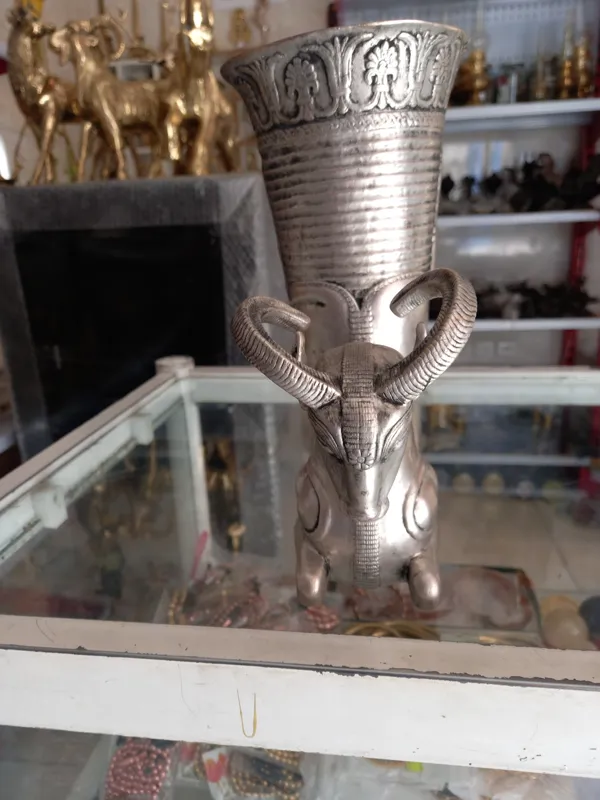 ریتون مسی با طراحی بی نظیر و کیفیت بالا نقش قوچ ابکاری نقرهای اندازه حدود 23سانت کلکسیونی وخاص هدیه وکادوی شیک وماندگار